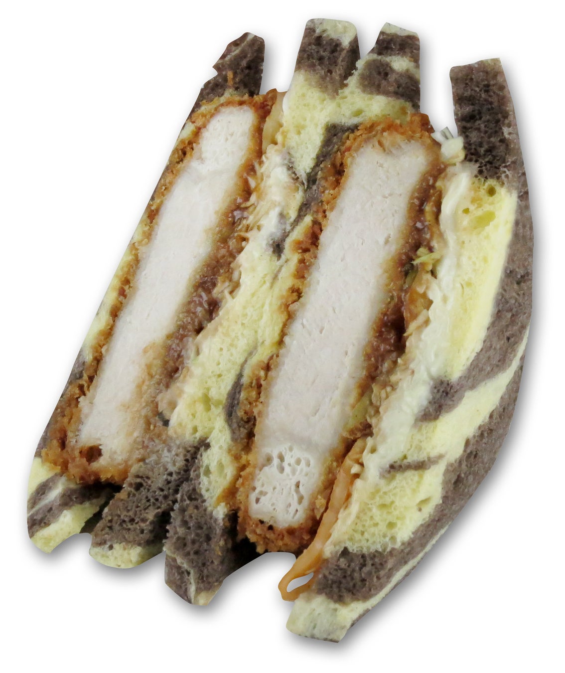 2019年に阪神百貨店限定で発売した商品です。ココア生地の茶色とパンプキン生地の黄色を虎模様に配置して焼き上げたその名も「虎食パン」にやわらかいフィレカツを挟みました。