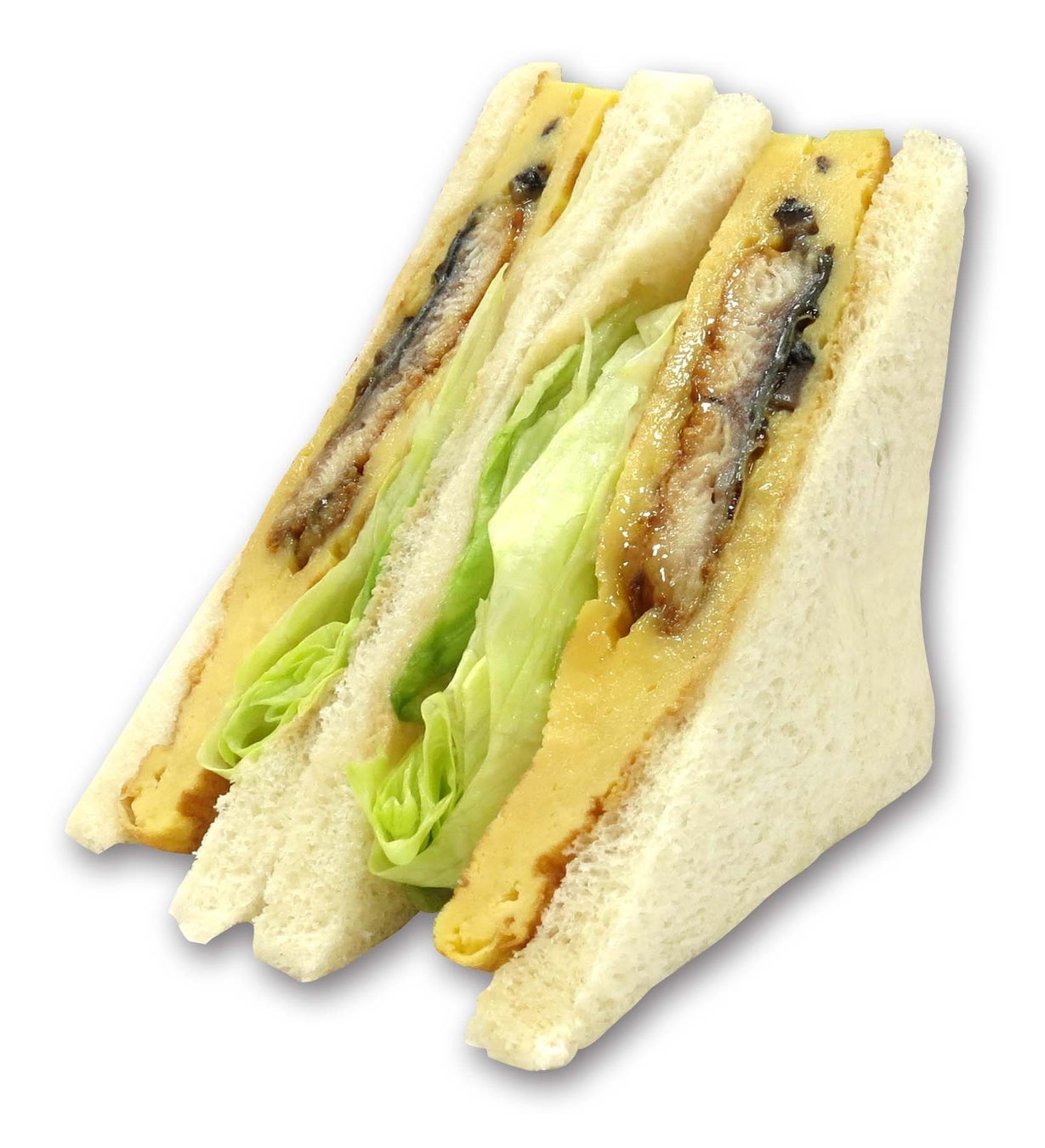 土用の丑の日に合わせ販売した商品で、甘辛いタレに一晩漬け込んだうなぎをたまごと和え、レタスと一緒に挟みました。