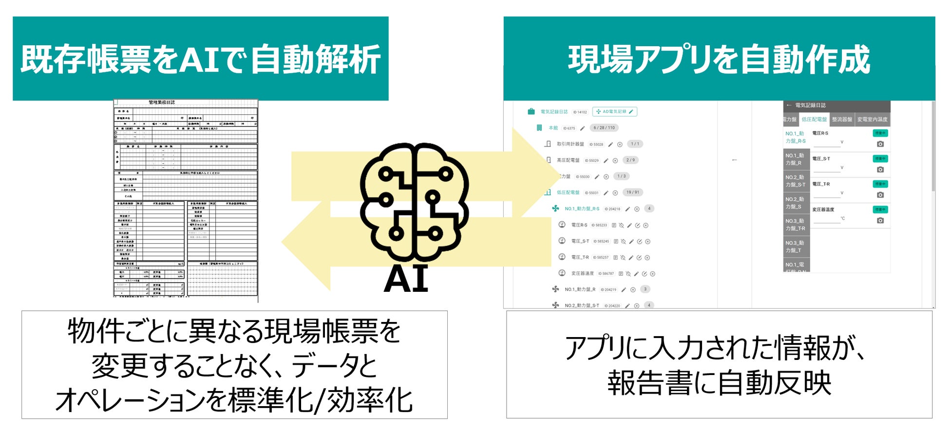 なお、物件ごとに報告書のフォーマットが異なるケースが非常に多く、通常これらの報告書をシステムに実装しようとすると莫大な開発費がかかります。管理ロイドでは、報告書がExcelの形式であればどんなフォーマットでもAIの自動解析によりシステムにアップロードすることが可能です。アップロードされた報告書をもとに現場アプリが自動作成され、アプリに入力された情報が、報告書に自動反映されます。