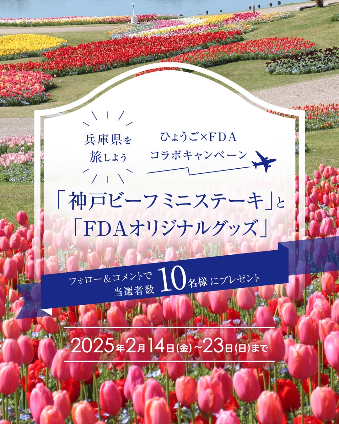 2/14(金)~2/23(日)の期間にフジドリームエアラインズとコラボして「神戸牛上モモやわらかミニステーキ」と「FDAオリジナルグッズ」が当たるプレゼントキャンペーンを「Instagram」で実施中