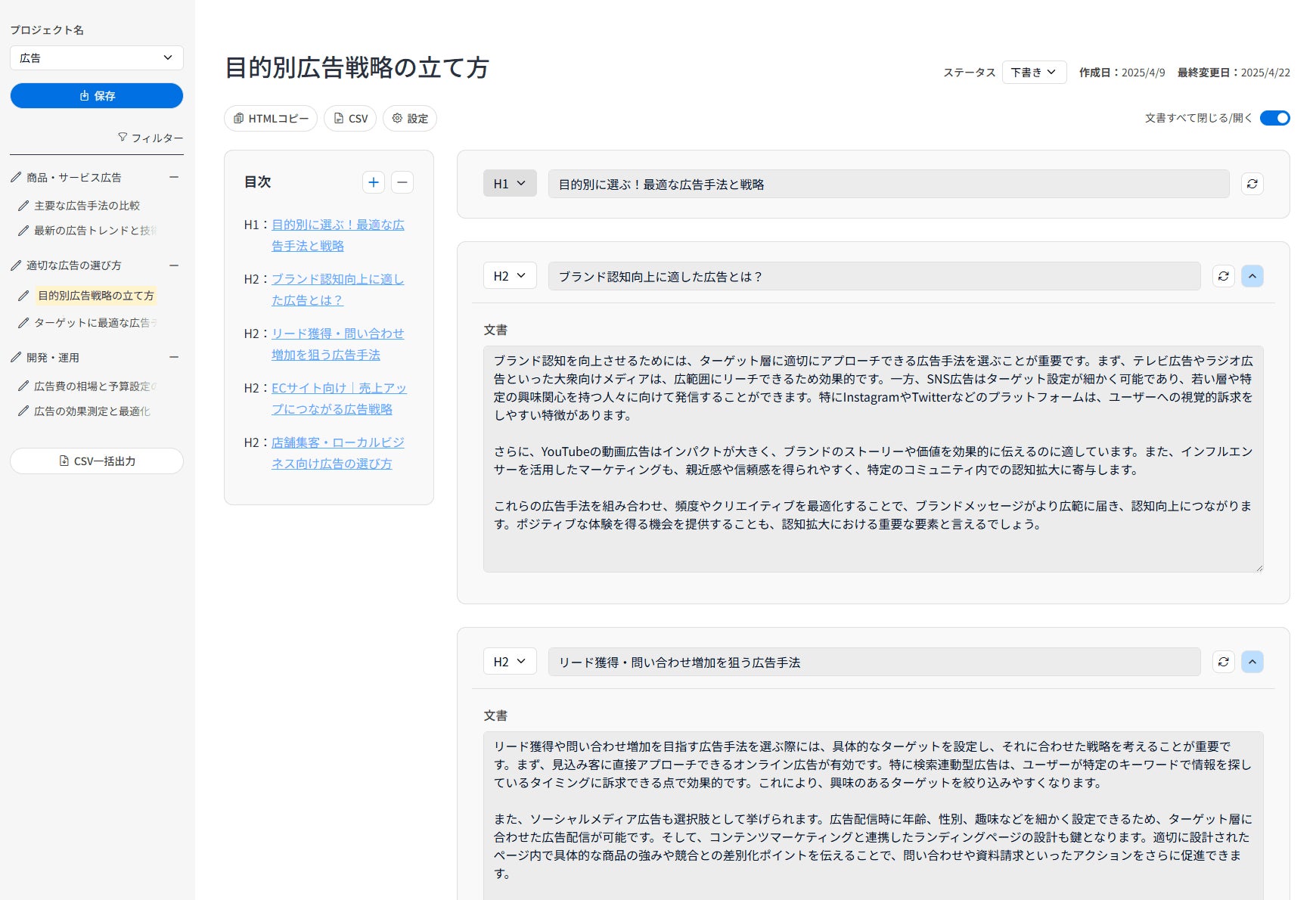 キーワード選定から構成提案、本文生成まで一貫して支援し、コンテンツ制作の難易度を大幅に軽減します。また、AIによる自動生成だけでなく、すべての出力内容に対して人間によるファクトチェックを徹底し、品質と信頼性を確保しています。