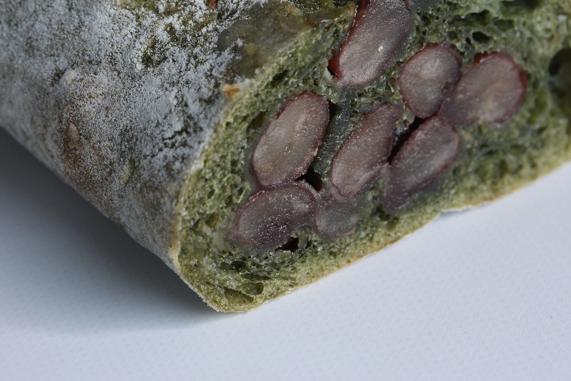 草餅をイメージして、甘さ控えめの大納言鹿の子をたっぷりと包み込んだ和菓子のようなパン。