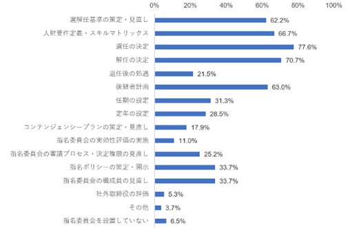 指名委員会、報酬委員会の開催回数は双方とも増加傾向にあった。指名委員会の審議事項では、「選任の決定」(77.6%)を挙げる企業の割合が最も多かった。「選任の決定」「解任の決定」の審議の対象者を役位別にみると、社長・CEOはほぼ全て、社外取締役では約8割の企業が実施していた。報酬委員会では、最も多く挙げられた「報酬水準・構成(MIX)」(90.3%)など多くの審議事項で増加傾向がみられた