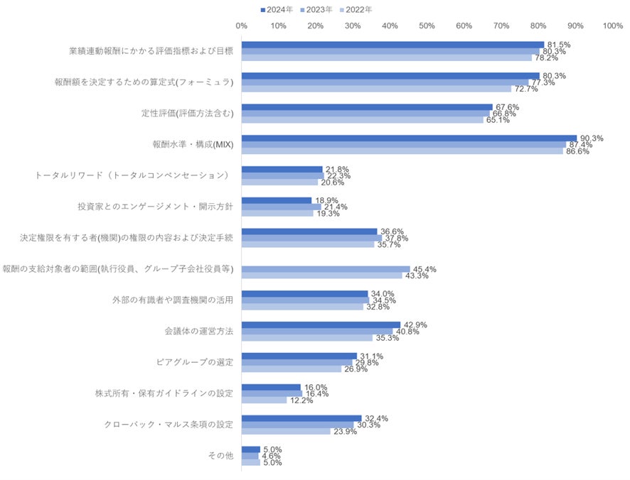 直近3年間連続して本サーベイに参加している238社(報酬委員会設置済)を対象に報酬委員会の審議事項を確認すると、最も多く挙げられた「報酬水準・構成(MIX)」(90.3%)をはじめ、「定性評価」(67.6%)、「会議体の運営方法」(42.9%)、「クローバック・マルス条項の設定」(32.4%)、「ピアグループの選定」(31.1%)などが3年連続で増加しました(図表7)。他方、「投資家とのエンゲージメント・開示方針」は2割程度にとどまっています。報酬委員会の開催回数をみると、2024年の平均値は4.9回であり、2022年の4.3回、2023年の4.7回から増加傾向にありました。