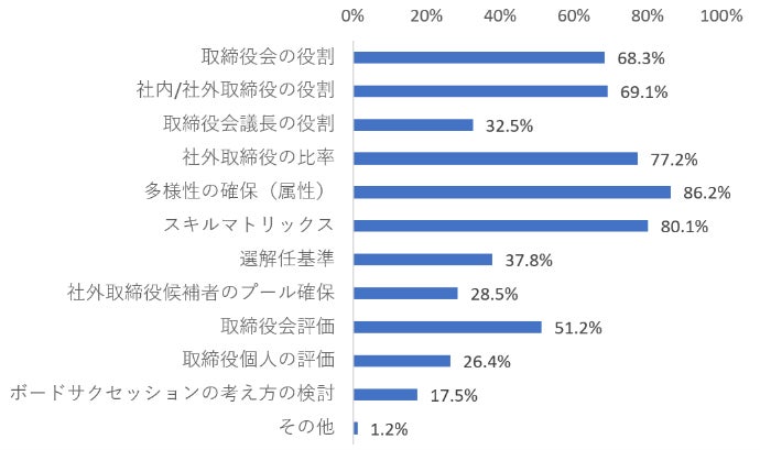 「多様性の確保(属性)」(86.2%)、「スキルマトリックス」(80.1%)、「社外取締役の比率」(77.2%)が多数を占めていました。他方で、「取締役個人の評価」、「ボードサクセッションの考え方の検討」といった要素を取締役会構成の見直しにあたって考慮する企業はそれぞれ26.4%、17.5%と少数にとどまりました。