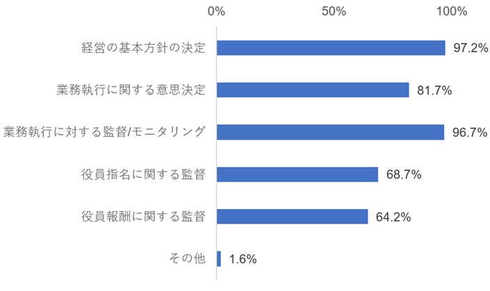 本年のサーベイ参加企業(指名領域)を対象に取締役会の主要な役割を確認したところ、最も多かったのが「経営の基本方針の決定」(97.2%)であり、次いで「業務執行に対する監督/モニタリング」(96.7%)でした(図表1)。取締役会の役割として役員指名/報酬に関する監督を担っている企業はそれぞれ68.7%、64.2%と7割弱にとどまりました。