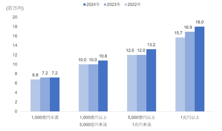 直近3年間(2022年~2024年)における社外取締役の総報酬額(中央値)は、特に時価総額1兆円以上の企業群で増加傾向がみられた