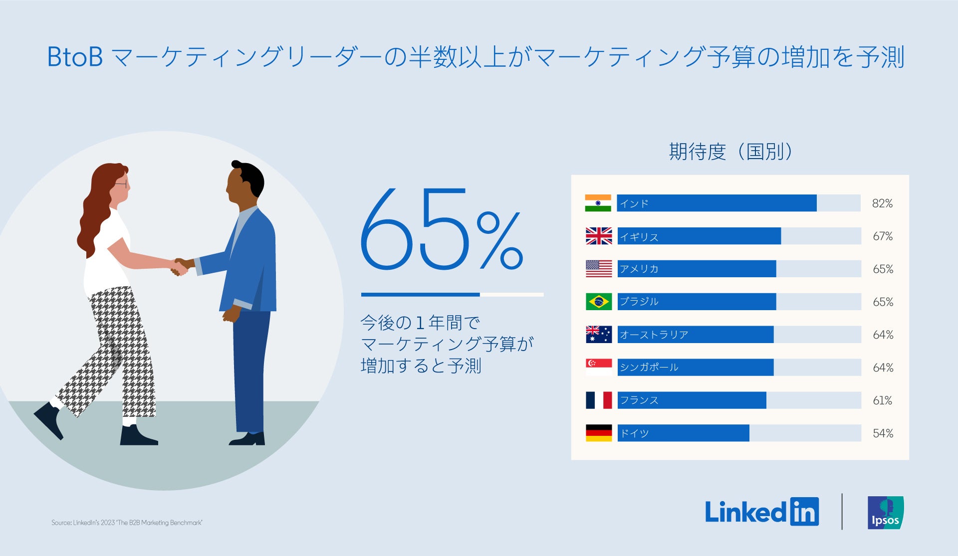 LinkedInはIpsosに依頼し、世界中の小規模、中規模、大規模な組織のCMO、CFO、シニアレベルのBtoBマーケター1,954人を対象に調査を実施しました(米国、英国、ドイツ、フランス、インド、オーストラリア、シンガポール、ブラジル)。調査は2023年3月24日から5月5日までオンラインで実施。また、過去の1年間にマーケターのLinkedInプロファイルに追加されたクリエイティブスキルの上昇を示すLinkedInのデータも参照しています。