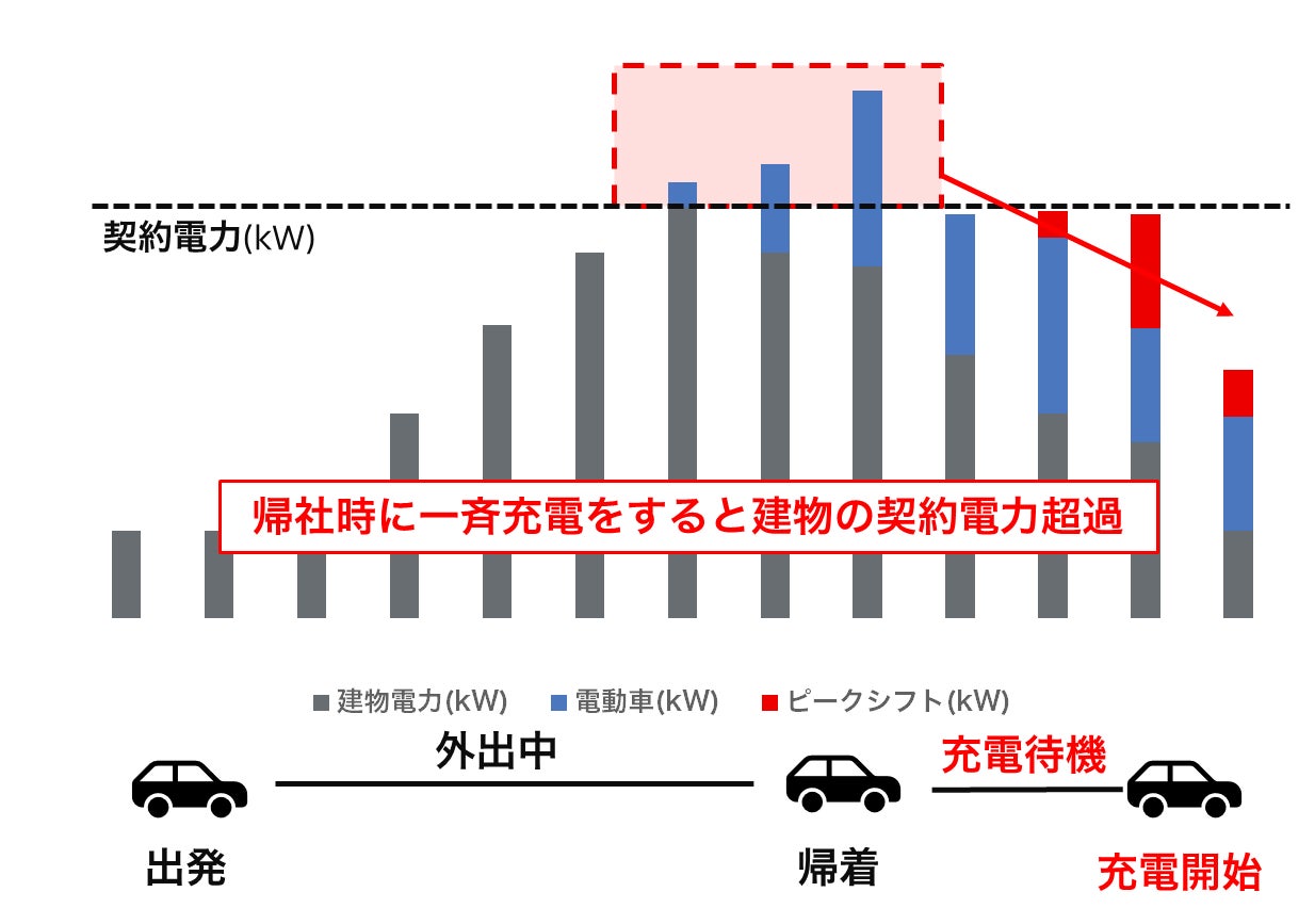 充電時間を制御することで、特定の時間に充電が集中することによる契約電力超過を解消することが可能になります。