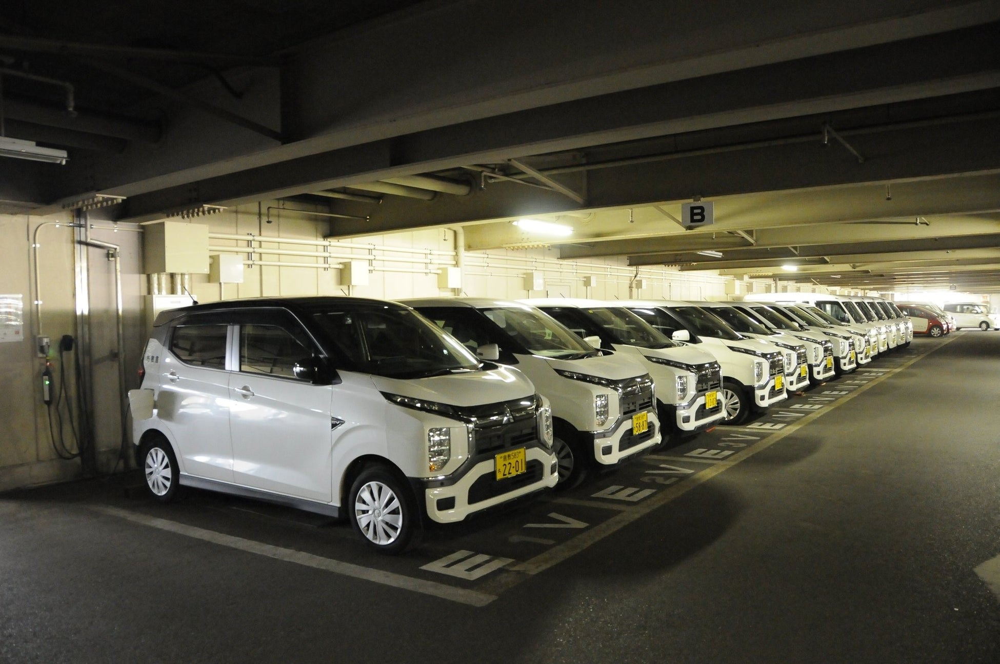 倉敷市は、2021年6月に「2050年ゼロカーボンシティ」へチャレンジすることを宣言しており、カーボンニュートラル化に積極的に取り組んでいます。三菱自動車の分析*によると、倉敷市が運用するバンタイプの軽自動車をEVに置き換えることにより、1台あたり年間で約7.2万円の燃料費と約0.49tのCO2を削減する効果があり、倉敷市はCO2ゼロの電力をさらに活用するためにも、EVの導入促進を進めています。公用車にEVを始めて導入した2009年以降も台数を増やし続け、2025年度には本庁舎で運用するEVが20台を超える見込みです。