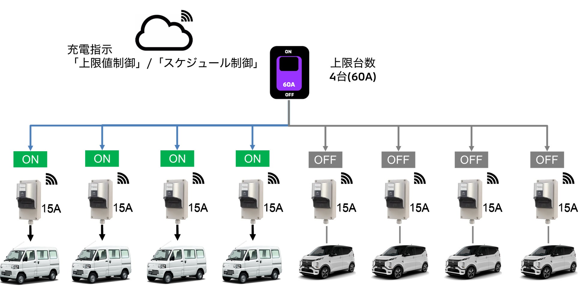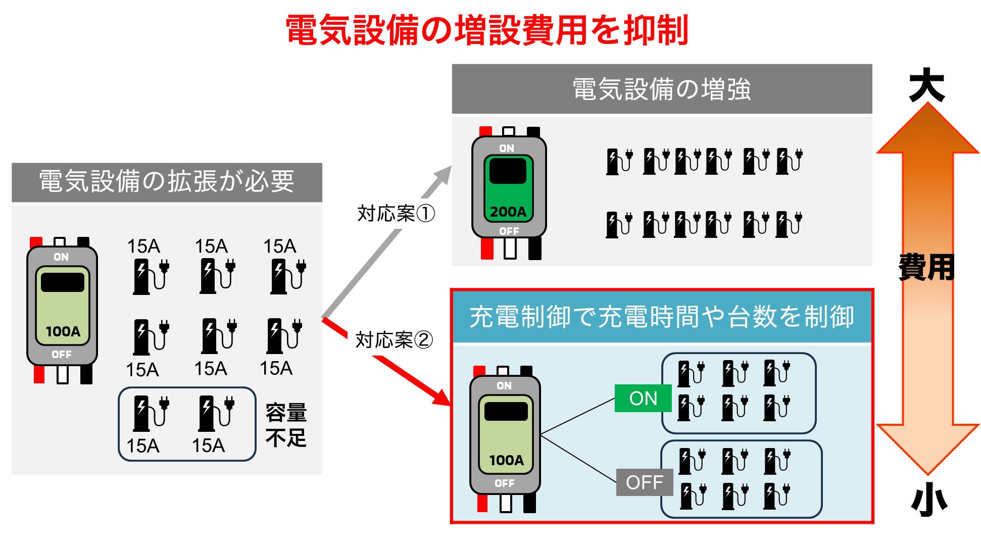 同時に充電する台数を制御することで、既設のブレーカー容量でもできる限り多くの充電器を同時に運用することが可能になります。