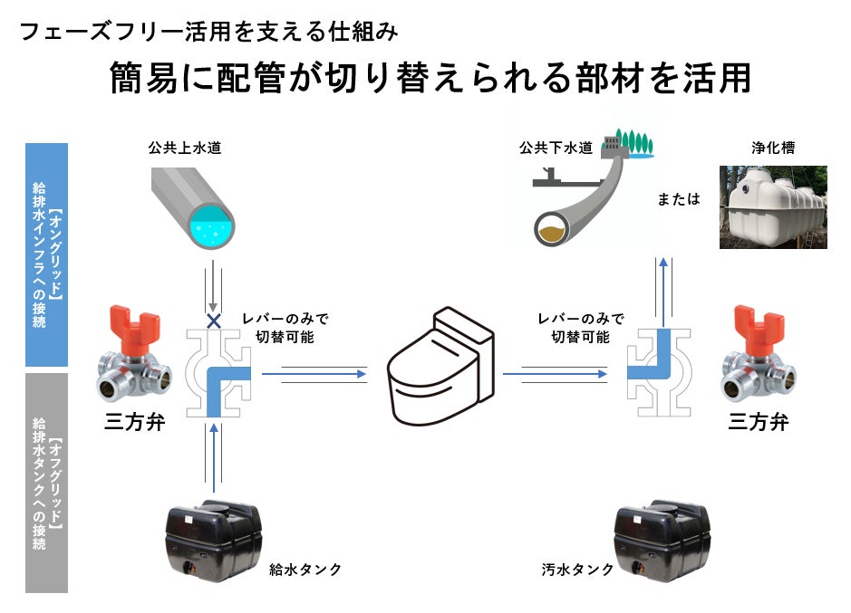 -平常時は上下水道に接続し、公園やイベント会場の常設トイレとして利活用可能。災害発生時には、簡易に給排水タンク利用に切り替えが可能。