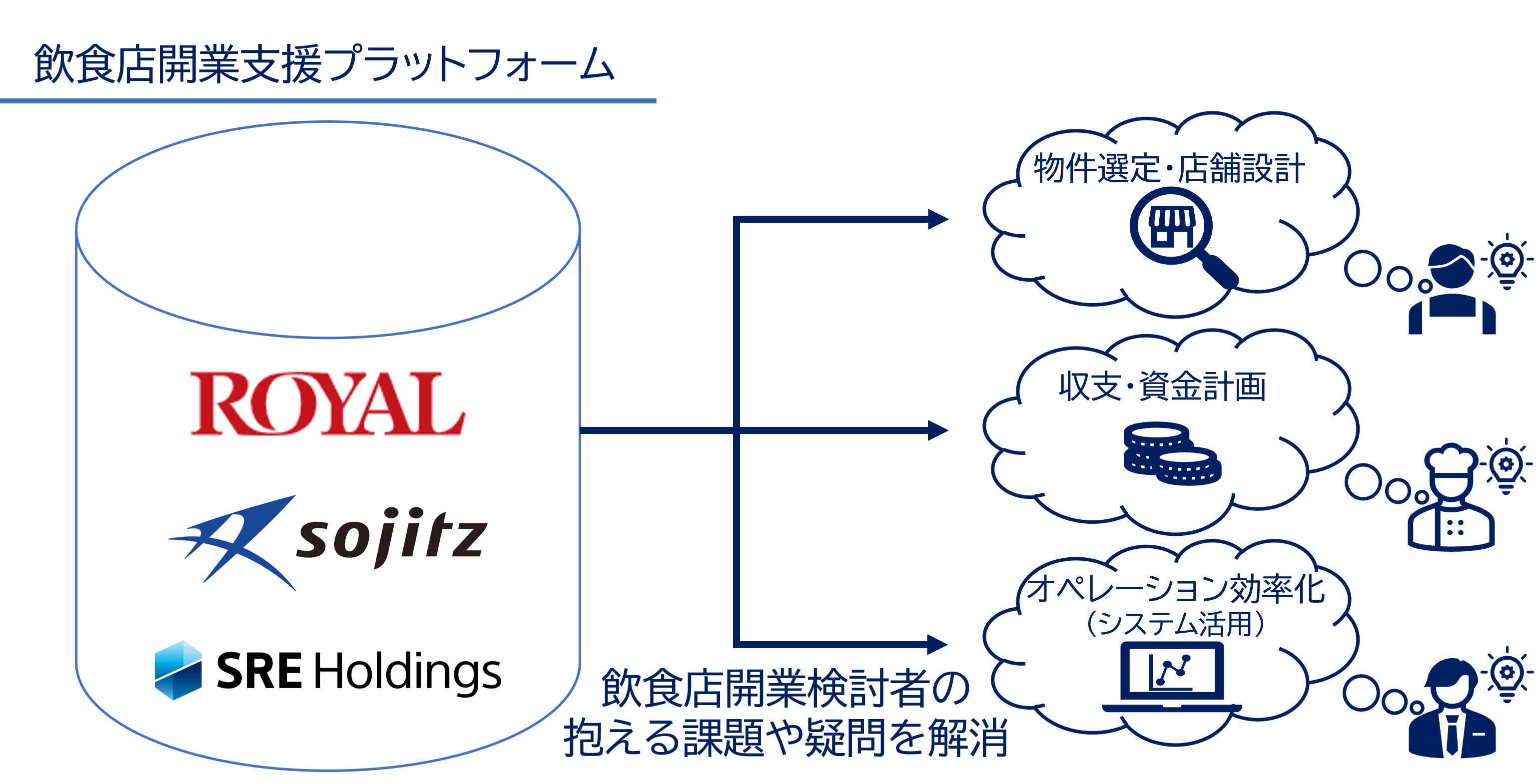 本プラットフォームでは、ロイヤルHD、双日、SREHDの3社がコンソーシアムとして、ロイヤルHDが「ロイヤルホスト」等のレストランチェーンの運営を通じて長年蓄積してきた飲食業界に関する知見やノウハウを活かし、飲食店開業者のニーズや開業のフェイズに即したかたちで、開業支援に関するサービスやソリューションを提供します。