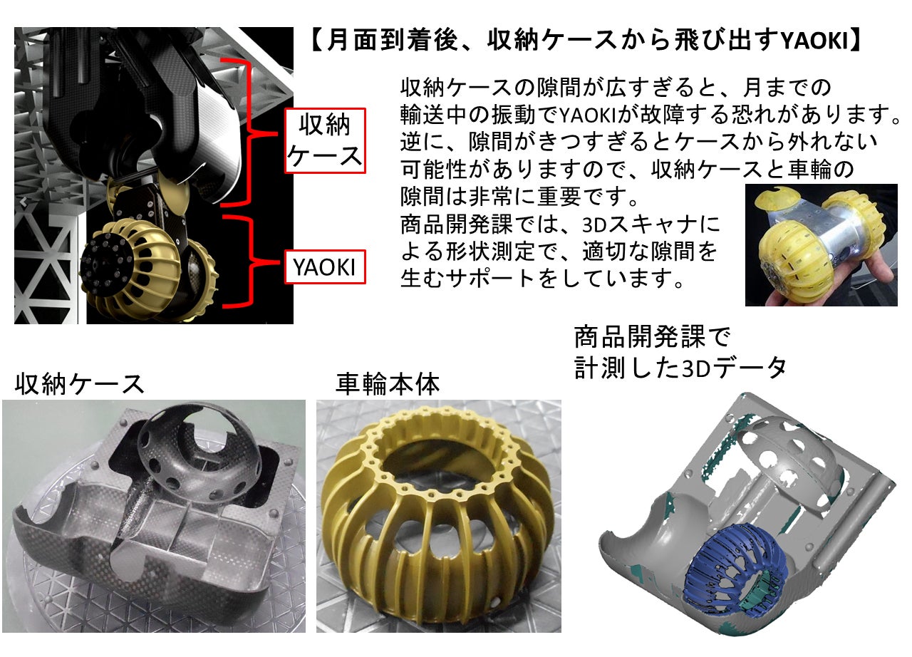 YAOKIの設計開発に際し、パンチ工業では、3Dスキャナによる3D形状測定技術を活用し、YAOKI本体のフライトモデルおよびデプロイヤー(YAOKI輸送用のケース)の最適な隙間(クリアランス)設定に貢献しました。