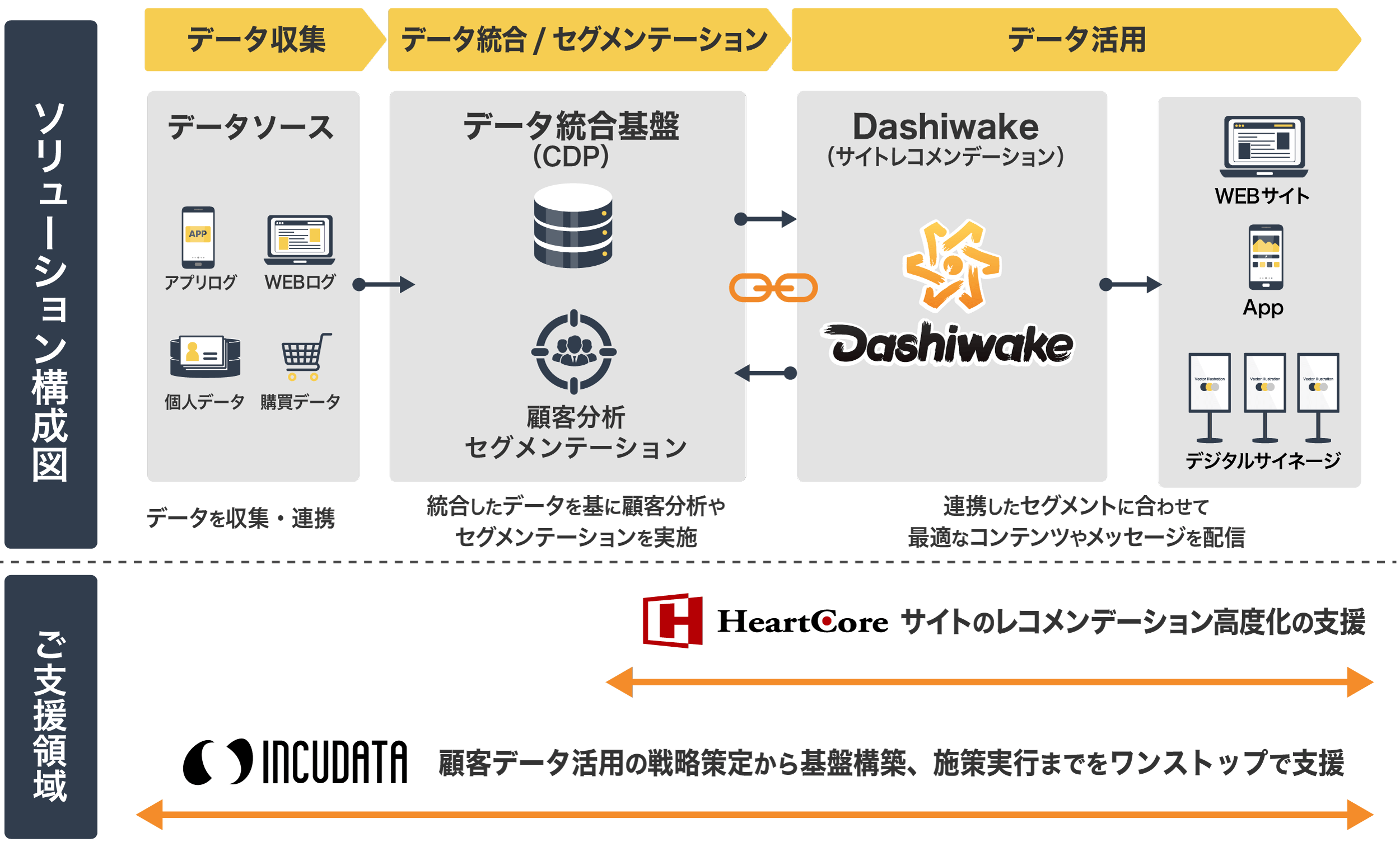 本協業では、顧客へ新たなソリューションを提供し、両社におけるデジタルマーケティング事業の拡大を目指します。インキュデータの持つ顧客データ活用領域におけるノウハウやCDP(Customer Data Platform)を活用したデータ分析基盤の構築・運用実績。ハートコアの持つ個人の属性や興味・関心に応じて、様々なチャネルへ企業の伝えたい内容を出し分けるクラウドサービス。それらを掛け合わせることで、CDPに蓄積された自社が保有する顧客データを更に利活用することが可能となり、企業が顧客一人ひとりに寄り添った情報発信を実現します。
