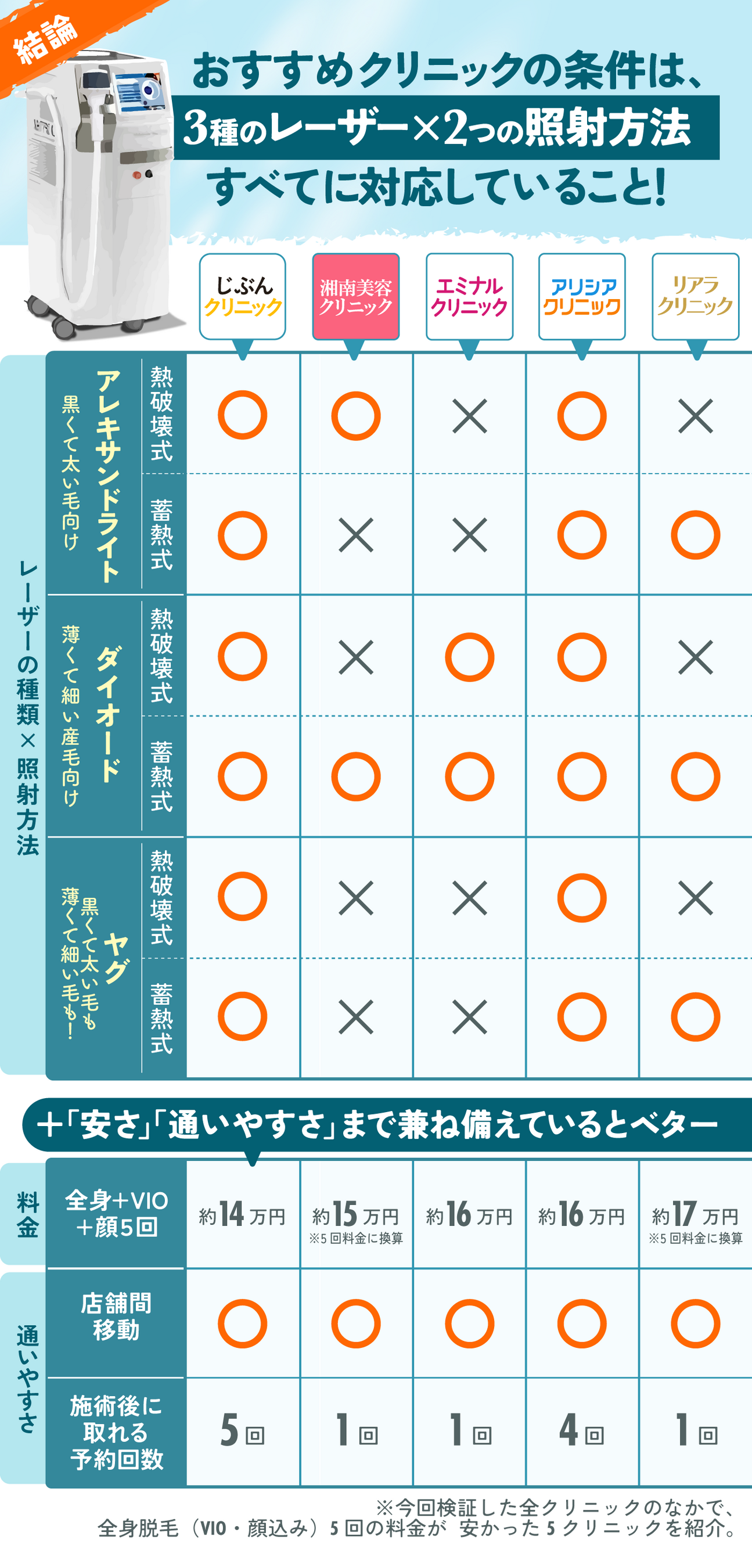 mybestでは、VIO・顔込みの全身脱毛5回コースの料金が安く、複数のレーザーを照射できる通いやすいクリニックを優れた医療脱毛クリニックと定義しています。