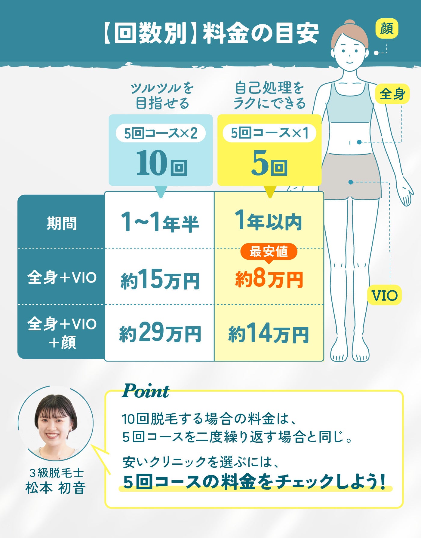 VIOと顔を含む全身脱毛5回の施術にかかるトータル費用。