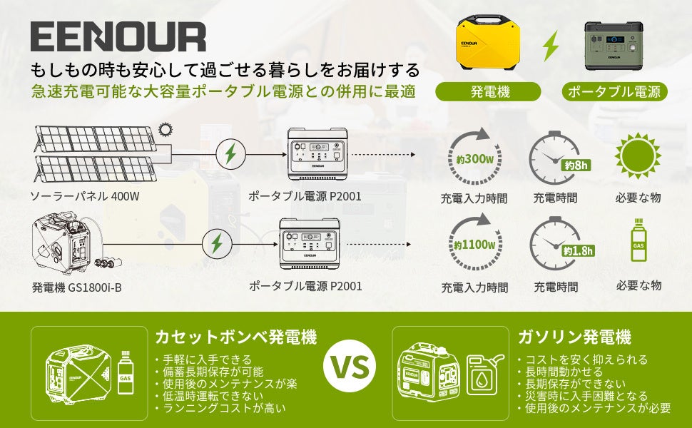 EENOURカセットボンベ式インバーター発電機GS1800i-B(1.3KVA)現場、キャンプ、DIY、車中泊、イベント、さらに災害時にも大活躍!