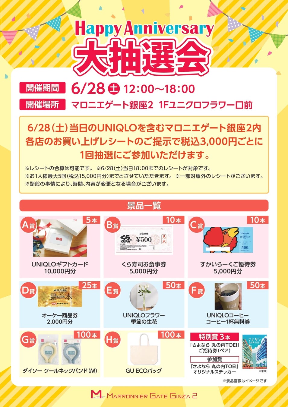 6月28日(土)当日のUNIQLOを含むマロニエゲート銀座2内各店のお買い上げレシートのご提示で税込3,000円ごとに、1回抽選に参加可能。