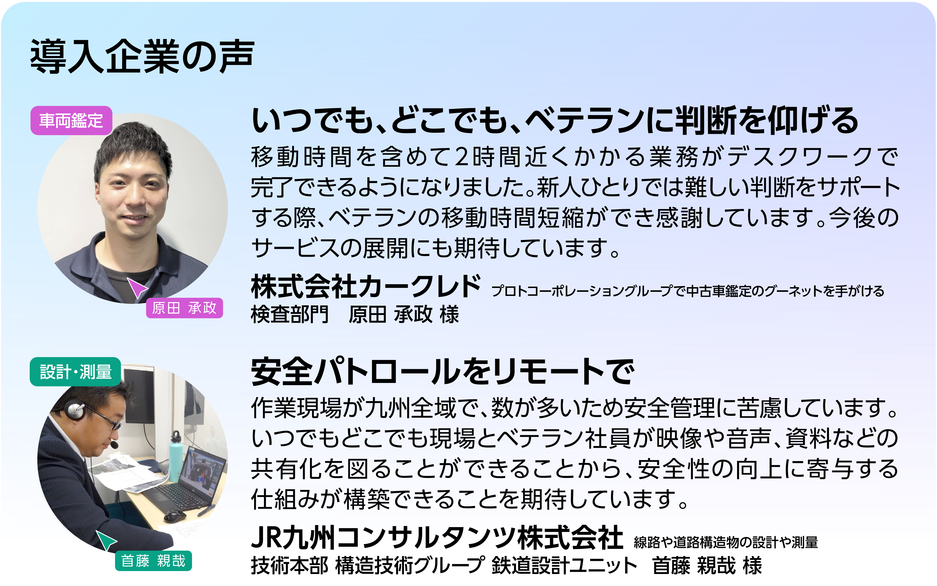 双方向のビジュアルコミュニケーションのできるポインタ、騒音対策、画質の良さなど、現場に寄り添って改善を重ねた機能が多く搭載されており、オフィスワーカー向けのビデオ通話ツールでは実現できなかった現場の遠隔支援が可能になります。製造業やメンテナンス業、建築業、行政などで幅広く導入されています。