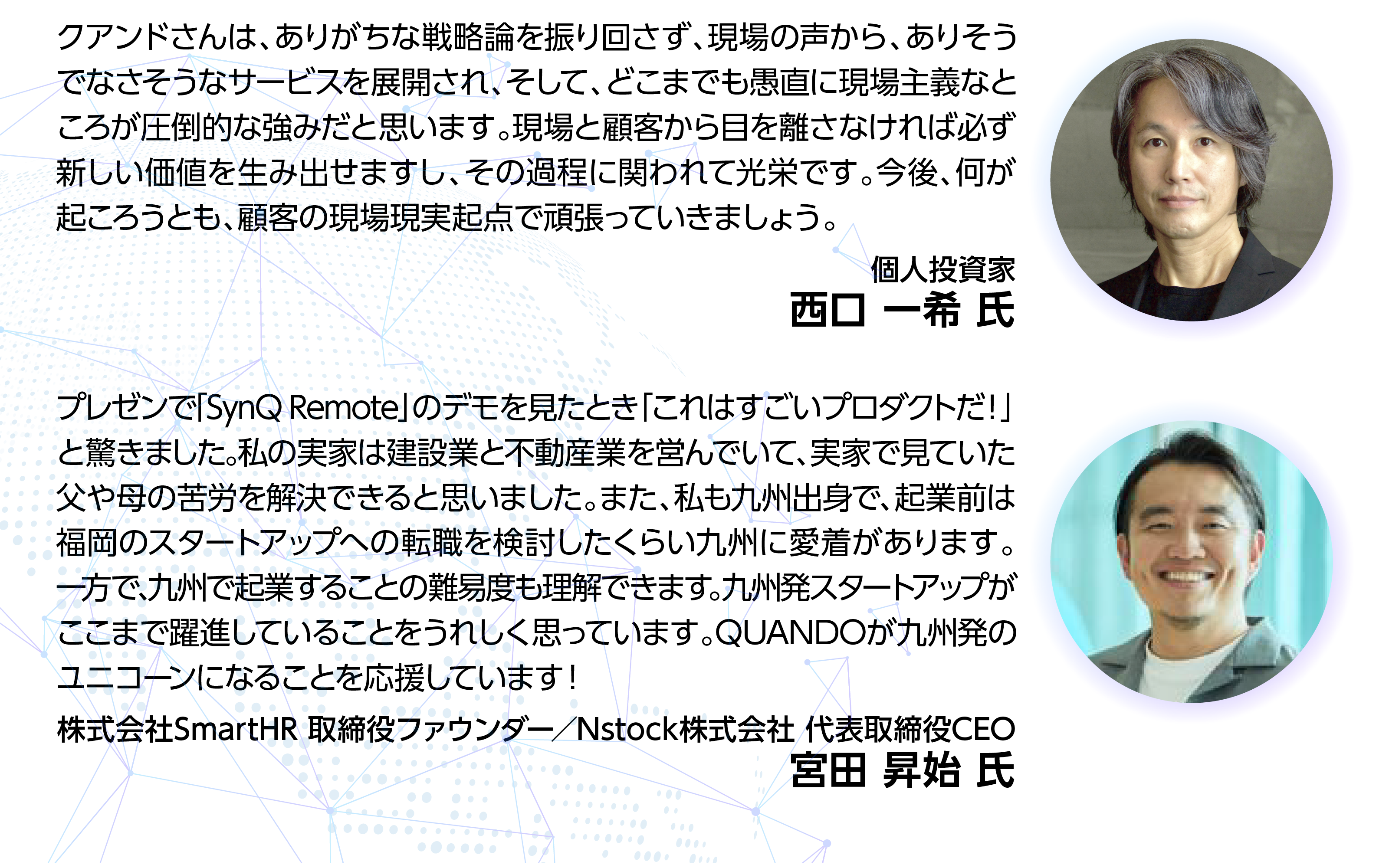 クアンドは、製造や建設、メンテナンスといった現場仕事に特化したビデオ通話アプリSynQ Remote(シンクリモート)を開発・販売しています。現場の対象物を双方向からポインタで指し示す視覚的な機能などによって、遠隔からプロが判断・指示することを可能にします。2030年には約38万人の人手が不足すると言われている製造業をはじめとするあらゆる現場において、技術者不足の解消や設備稼働停止時間の削減に貢献しています。