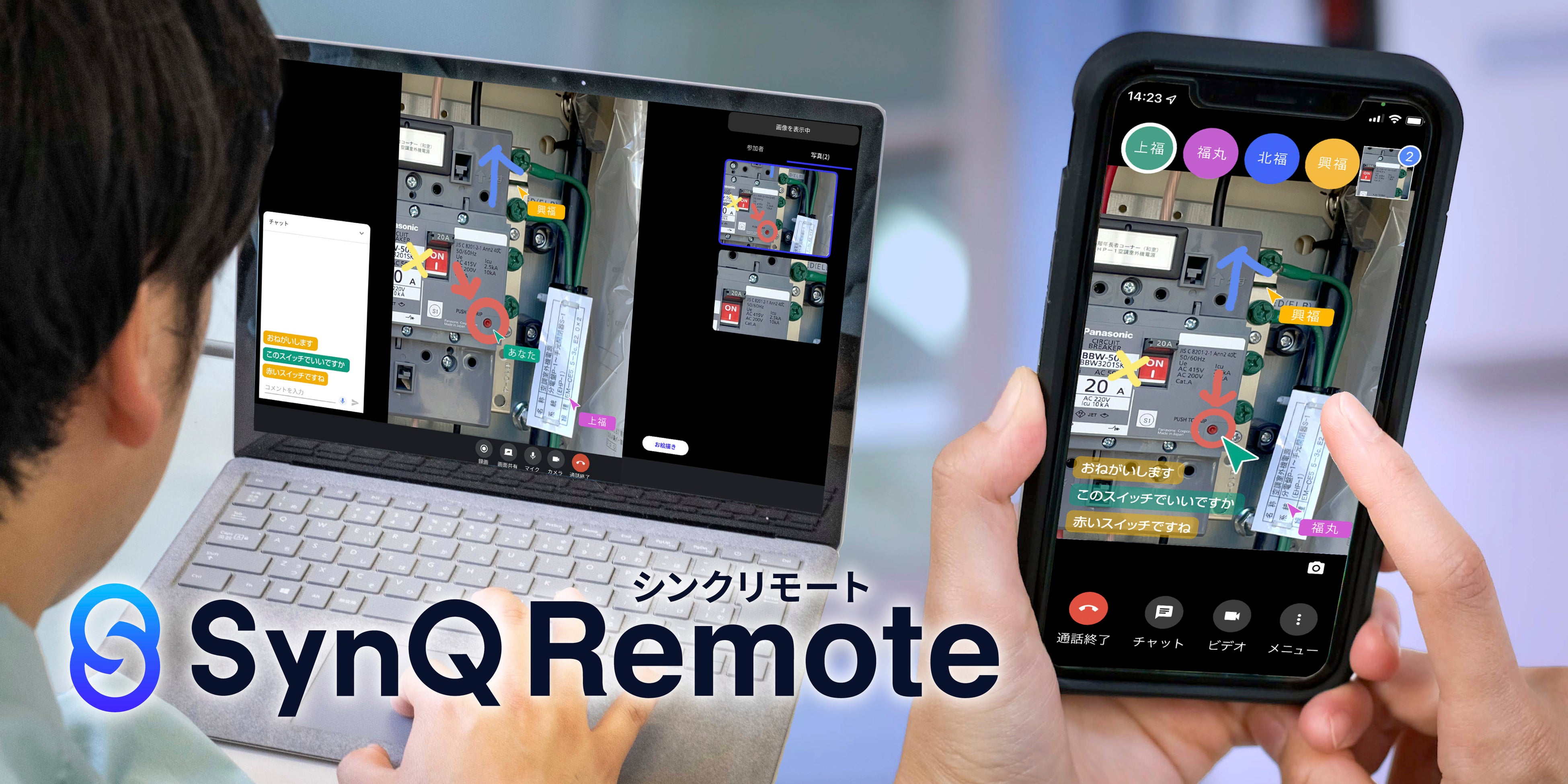 SynQ Remote(シンクリモート)は、現場の「あれ、これ、それ」が伝わるリモートコラボレーションツールです。遠隔からプロフェッショナルな判断を可能にすることで、人手不足・技術者不足、技術承継、労働集約型からの脱却といったあらゆる現場に共通する課題を解決します。ウェアラブルカメラなどのデバイスを準備することなく、手持ちのスマートフォンやPCにアプリをインストールするだけで使い始めることができます。