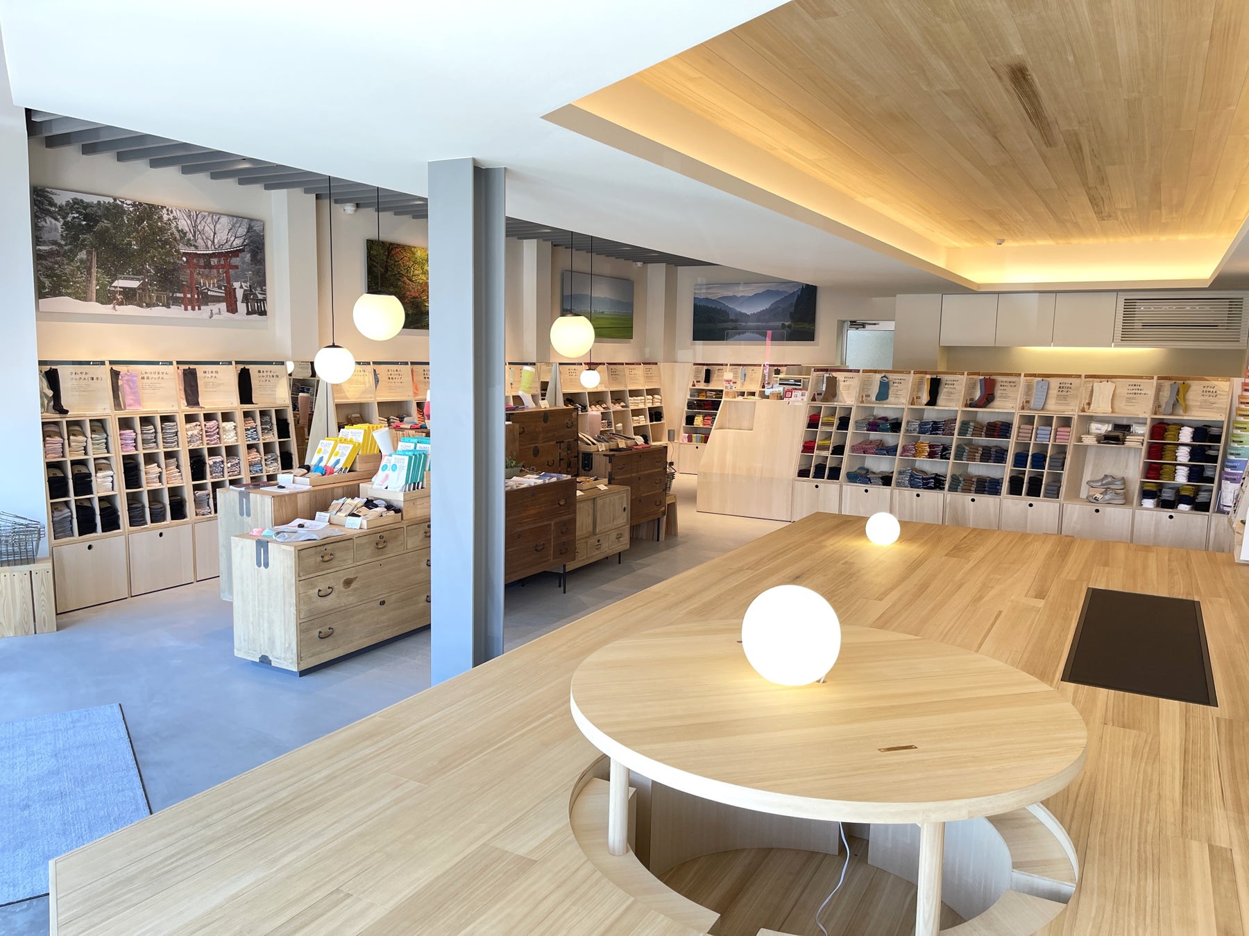 山忠本社向かいの自社靴下工場に併設するファクトリーショップ。お客様にほっこり寛いでいただけるよう大きな軒下と桐の縁台、そして小さなお庭をご用意いたしました。どこか懐かしい「縁側」のような空間でお話しながら、足に関心をもっていただけたら嬉しいです。