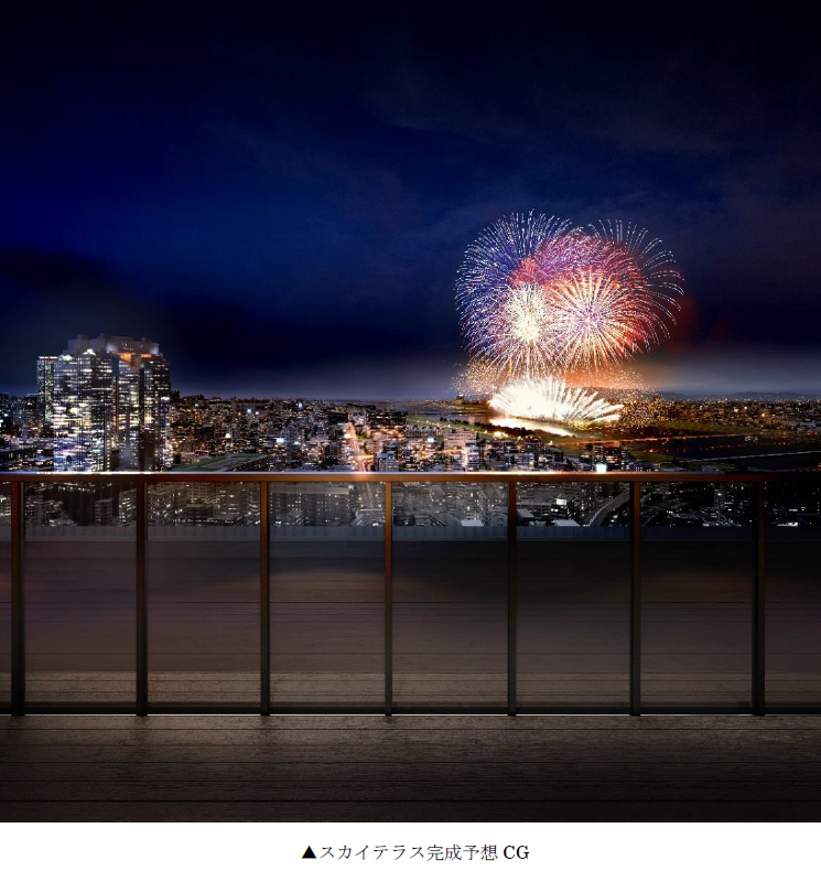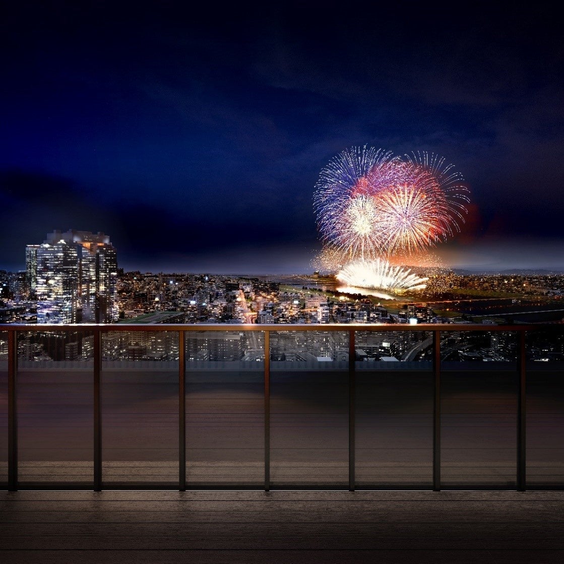 24階にコモンスペースとしてビューラウンジ、ゲストルーム、コワーキングスペースを用意。さらに35階(屋上階)にはスカイテラスを設置し、8月初め多くの人々で賑わう「なにわ淀川花火大会」の花火もすぐ近くに見ることができます。