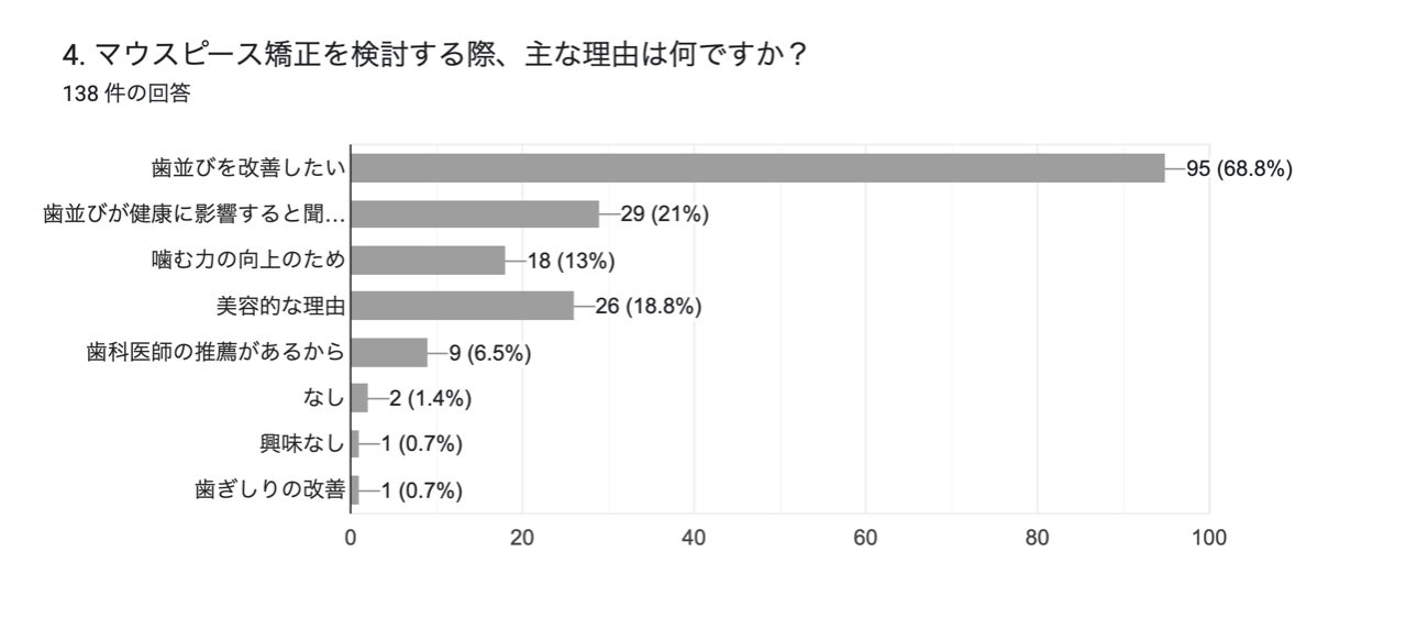 「マウスピース矯正を検討する際、主な理由は何ですか?」という質問に対し、美容的な理由でマウスピース矯正を検討している人が18.8%という結果が出ました。また、噛む力の向上を目的とする人が13%、歯並びが健康に及ぼす影響を考慮している人が21%であることも分かりました。