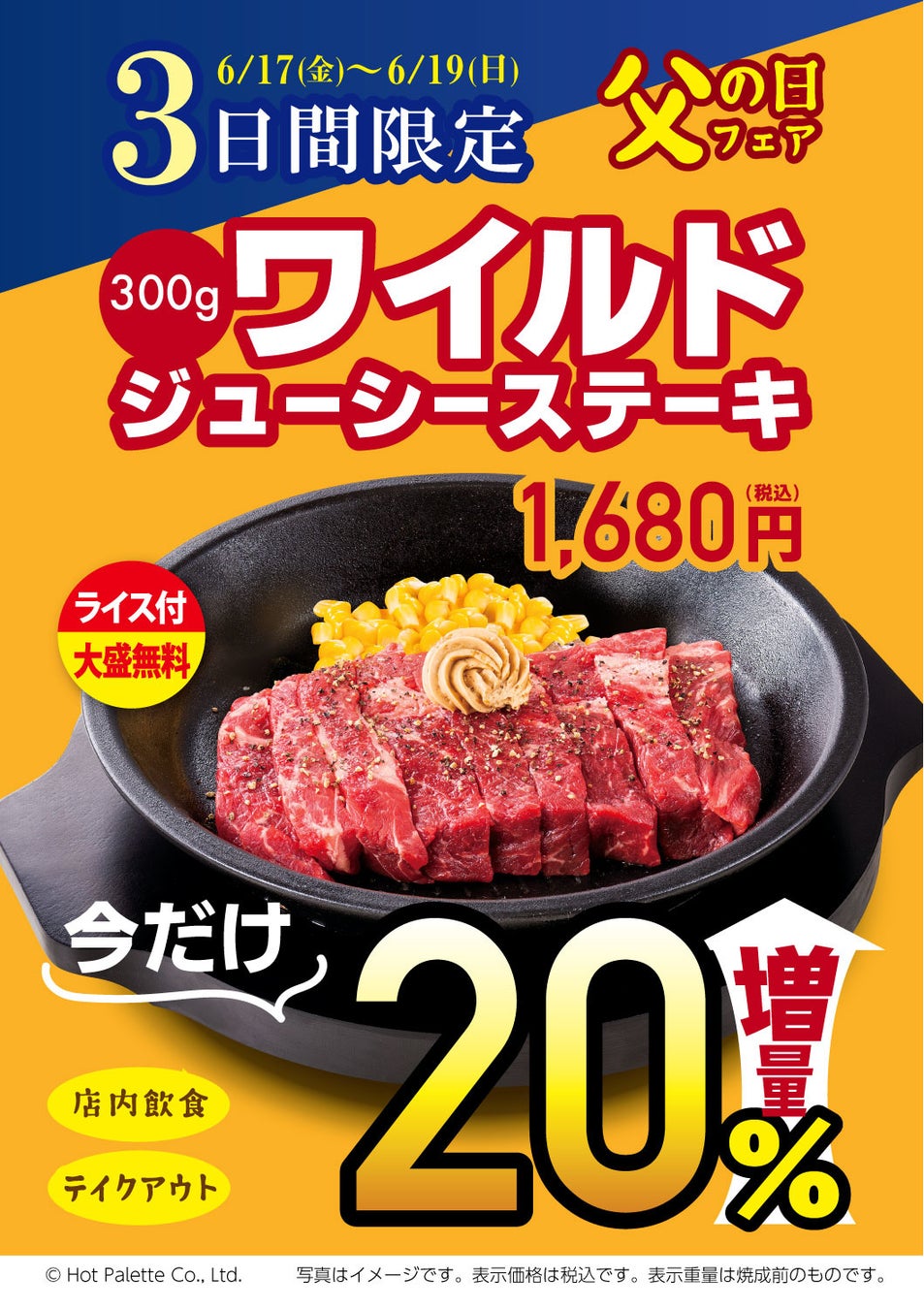6月19日は父の日。いつも家族のために頑張ってくれているお父さんに感謝をこめてペッパーランチが父の日フェアを開催します。人気商品のワイルドジューシーステーキ300gが、お値段そのままでお肉が20%増量の360g 。ぜひこの機会にお肉でパワーチャージしませんか?