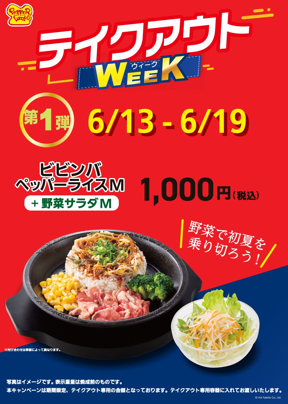 内容:テイクアウト限定で、ビビンバペッパーライスMサイズと野菜サラダMサイズのセットを1,000円(税込)で販売いたします。
