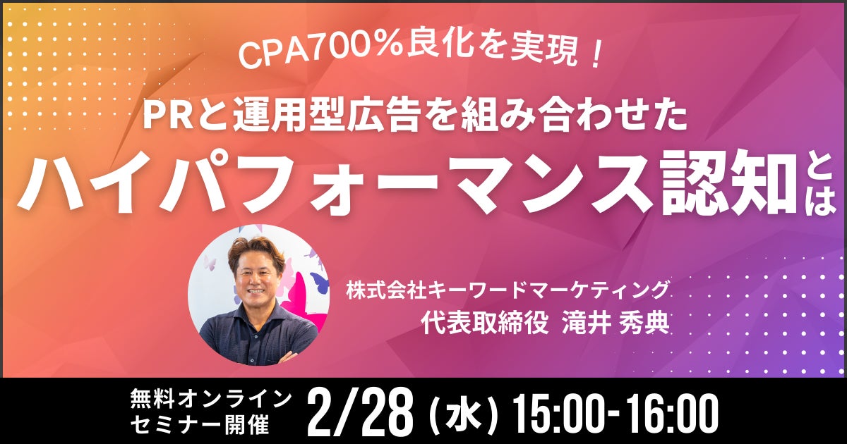 株式会社ベクトル(本社:東京都港区、代表取締役会長兼社長:西江 肇司、東証プライム:6058)の子会社である株式会社キーワードマーケティング(本社:東京都中央区、代表取締役:滝井 秀典)は、株式会社幻冬舎ゴールドオンライン(本社:東京都渋谷区、代表取締役:山下 征孝)と共同で、無料オンラインセミナー『CPA700%良化を実現!PRと運用型広告を組み合わせたハイパフォーマンス認知とは』を2月28日(水)15時より開催いたします。