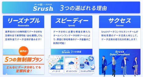 データ人材がいなくてもデータ活用が進むオールインワンデータ分析ツール「データ統一クラウドSrush」と、データ基盤の構築からデータ分析の定着支援まで行う「コンサルティングサービス」を提供しています。業界初の【ライセンス数・データ連携数・データ容量・ダッシュボード&グラフ作成数・チャットサポート】 の5つが無制限になる革新的プランでデータドリブン経営を定額料金で実現できます。