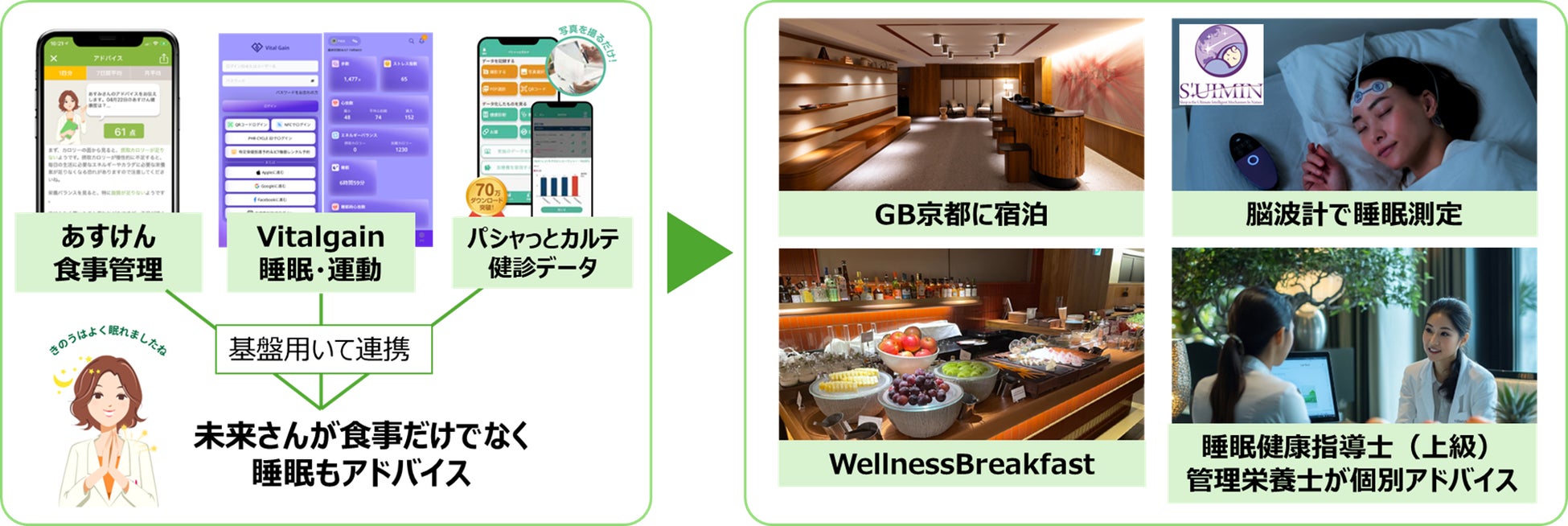 より詳細な睡眠アドバイスを希望する方には、グリーンハウスグループが運営する「ホテルグランバッハ京都セレクト」において、睡眠に最適な環境を整えた専用ルームで睡眠時の脳波を測定し、その結果に基づいて当社の管理栄養士・上級睡眠健康指導士から一人ひとりに合わせた睡眠アドバイスを提供。『あすけん』に連携したPHRだけでなく、日常生活をヒアリングしたうえで睡眠アドバイスを行うため、一層パーソナライズされたアドバイスによる睡眠課題への気づきや行動改善の促進が期待されます。