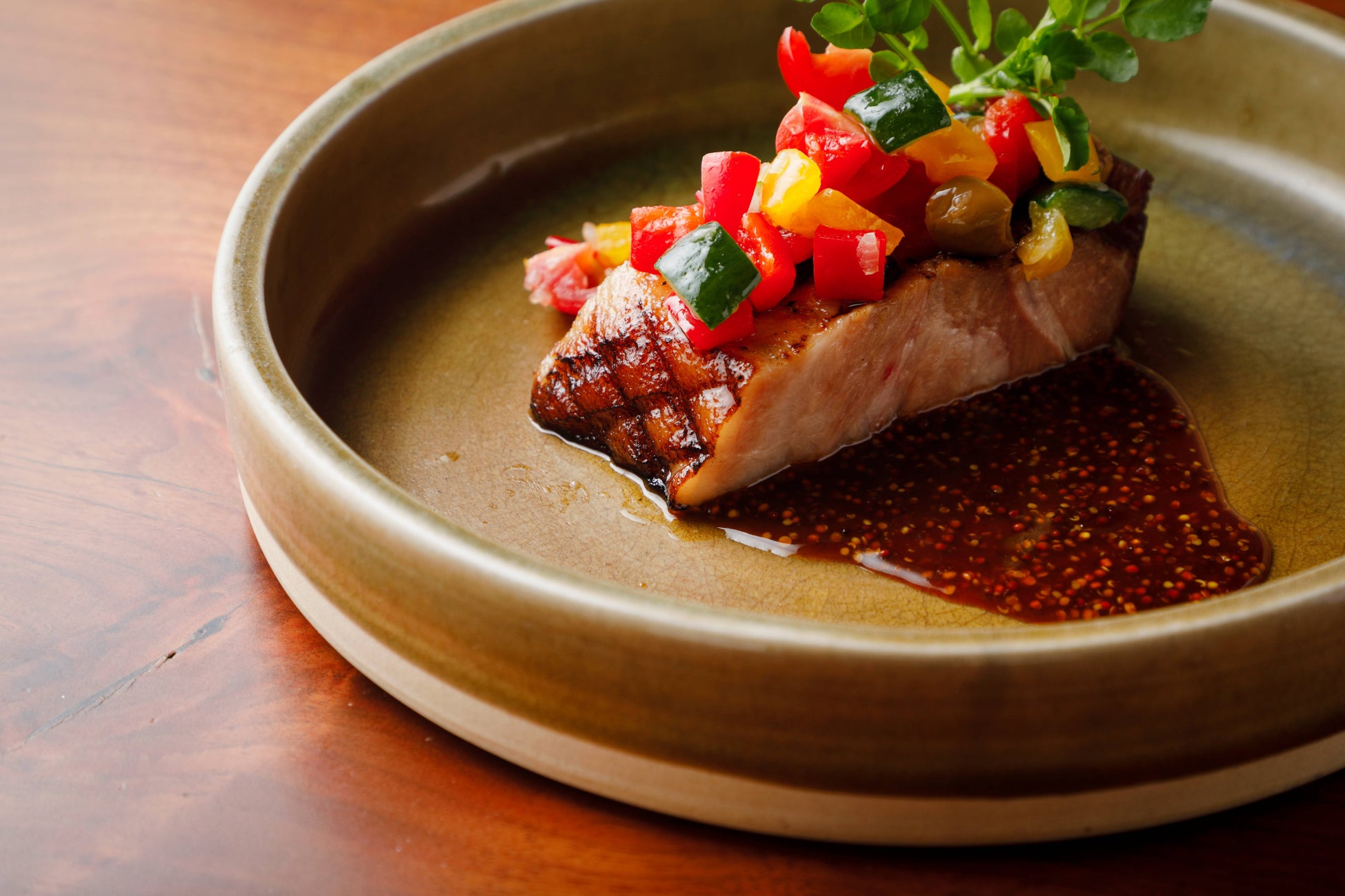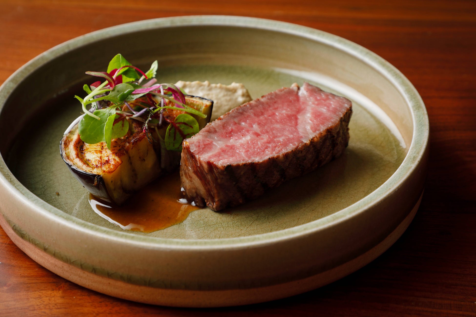 霜降りがきめ細かく風味豊かな和牛と、京都の夏の定番、賀茂茄子をグリルで堪能できる贅沢なメインディッシュです。肉汁があふれるジューシーで柔らかなサーロインと、繊維が詰まった肉厚な賀茂茄子の、ほっくりかつとろりとした絶妙な焼き加減をお楽しみいただけます。ハーブと赤ワインビネガーで作るチミチュリソースでお召しあがりください。