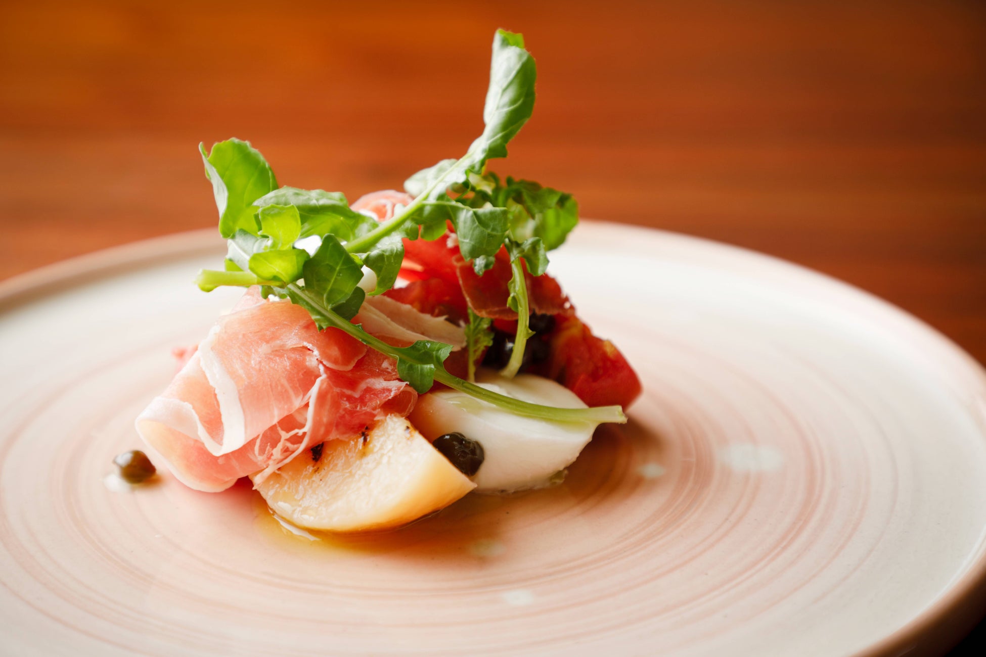 桃の優しい甘み、トマトの酸味、ハモンセラーノの塩味が絶妙な味わいを奏でる夏にぴったりの爽やかな冷製の前菜は、グリルした桃を冷やし、オリーブオイルでマリネすることで桃のフルーティーな甘みと芳醇な香りを引き立てる、夏のコースのはじまりにぴったりの一品です。