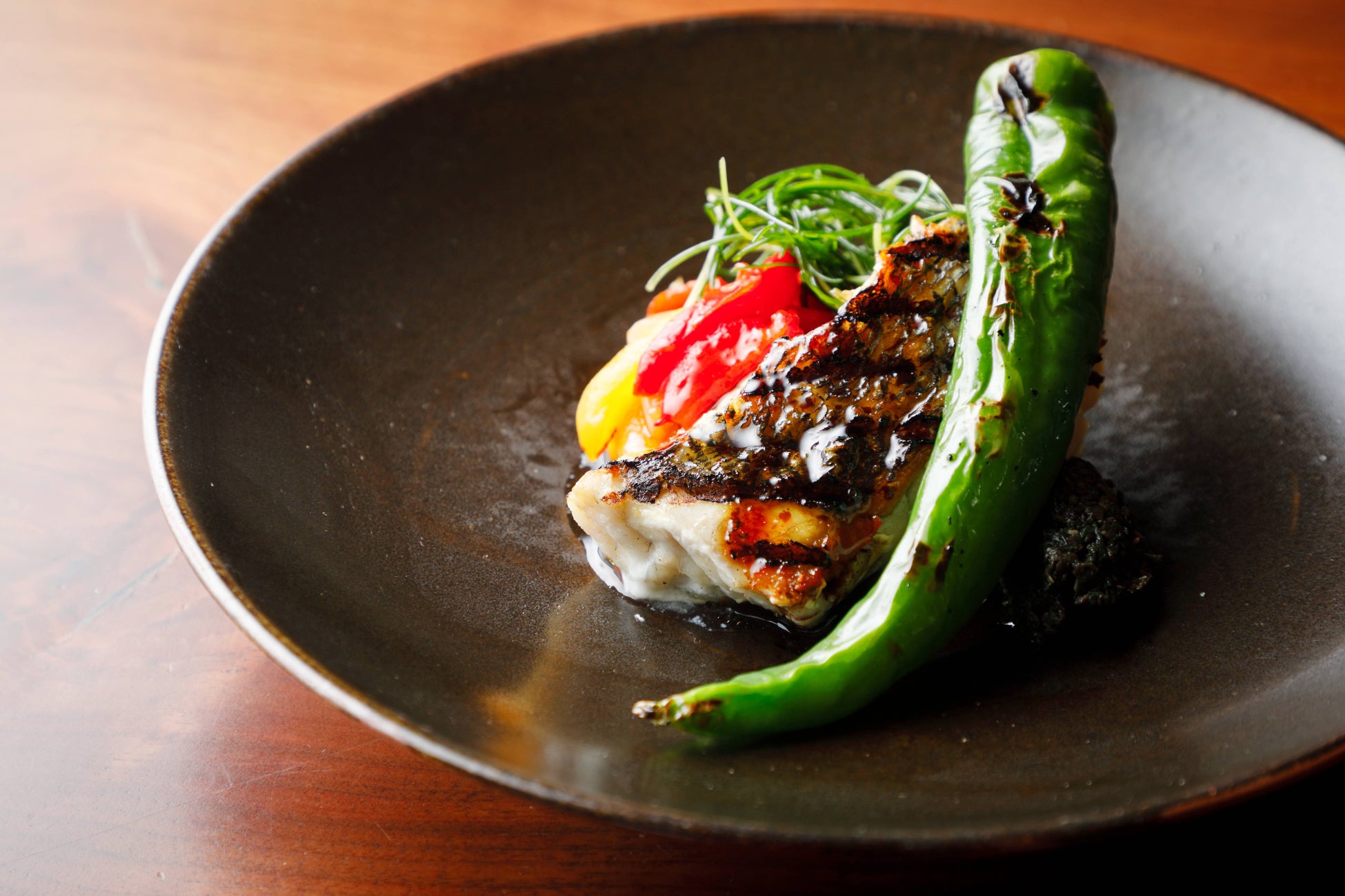 ・鱸のグリル 万願寺唐辛子 紫蘇 オリーブタプナード