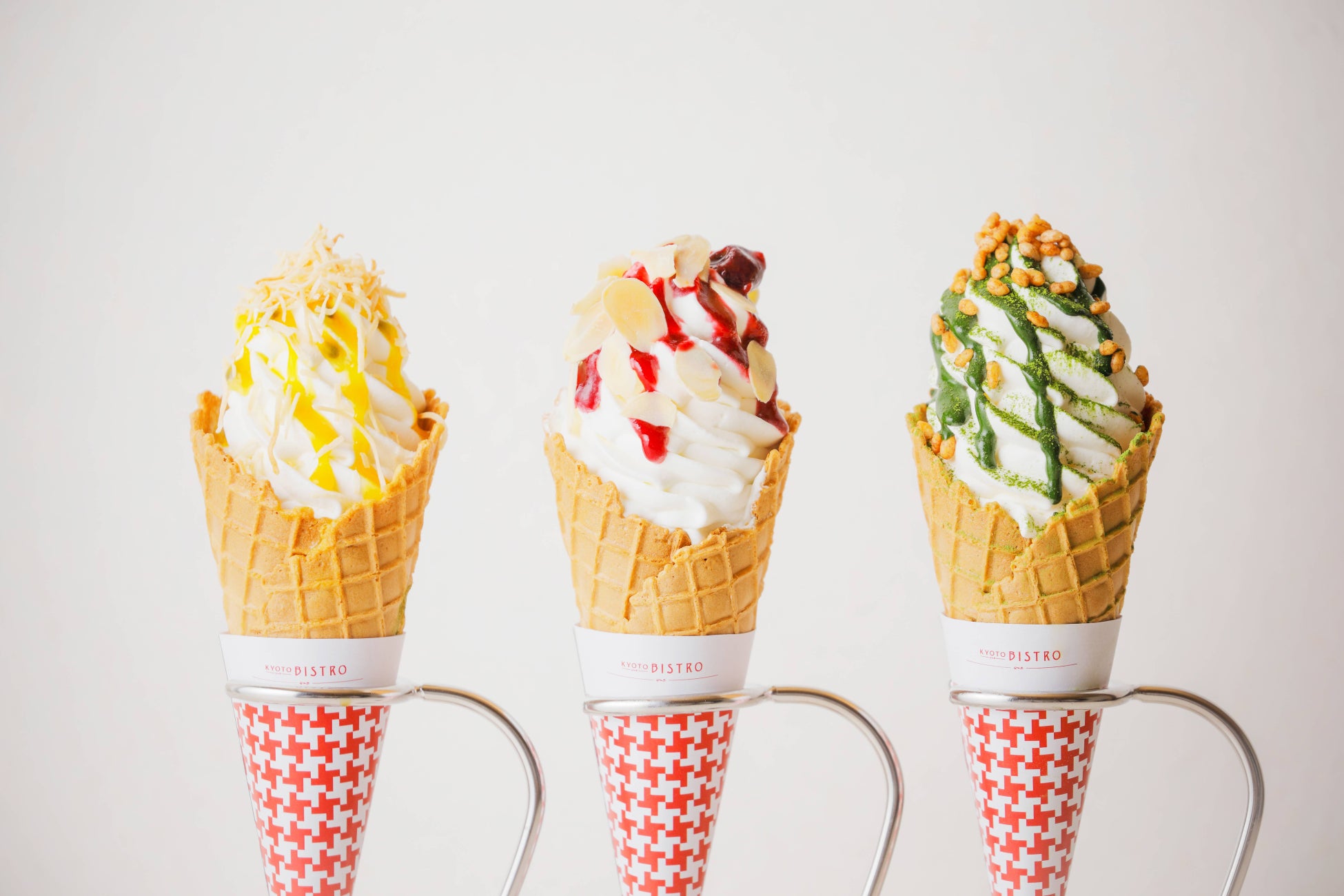 抹茶: 一保堂茶舗の「幾世の昔(いくよのむかし)」を使用したオリジナルの抹茶ソースでいただくソフトクリーム。「幾世の昔(いくよのむかし)」の特長であるクセがなくまろやかな抹茶の味わいを生かして作ったオリジナルソースは、芳醇な香りとまったりとコク深いテイストで、京都ならではの美味しさを堪能できる一品です。