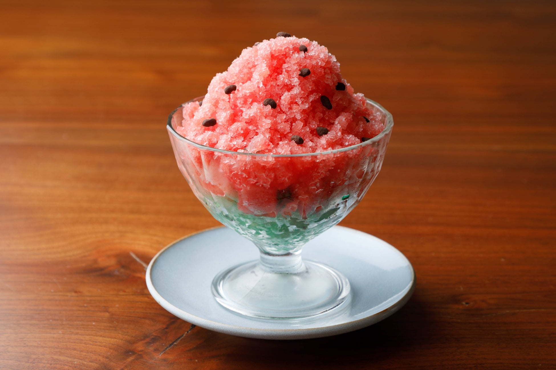スイカとライムの果汁から作る、愛らしく涼やかなビジュアルが目を引く夏にぴったりのデザートです。氷の中にはダイスカットしたスイカを忍ばせており、口に運ぶごとにスイカのフレッシュな味わいと、ライムの香りが上品に広がります。ひんやりとした口当たりが夏の太陽で火照った身体をクールダウンさせる、夏にぴったりのデザートです。