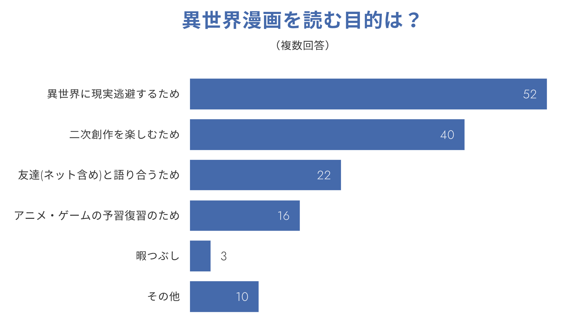 最も多かったのは「異世界に現実逃避するため」、次いで「二次創作を楽しむため」がランクイン。漫画を読む時の没入感が目的になっていることが分かります。