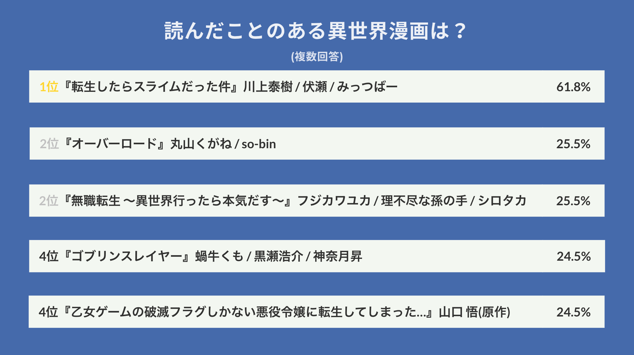 また、その中で最も好きな異世界漫画を尋ねたところ、以下の作品がランクインしました。