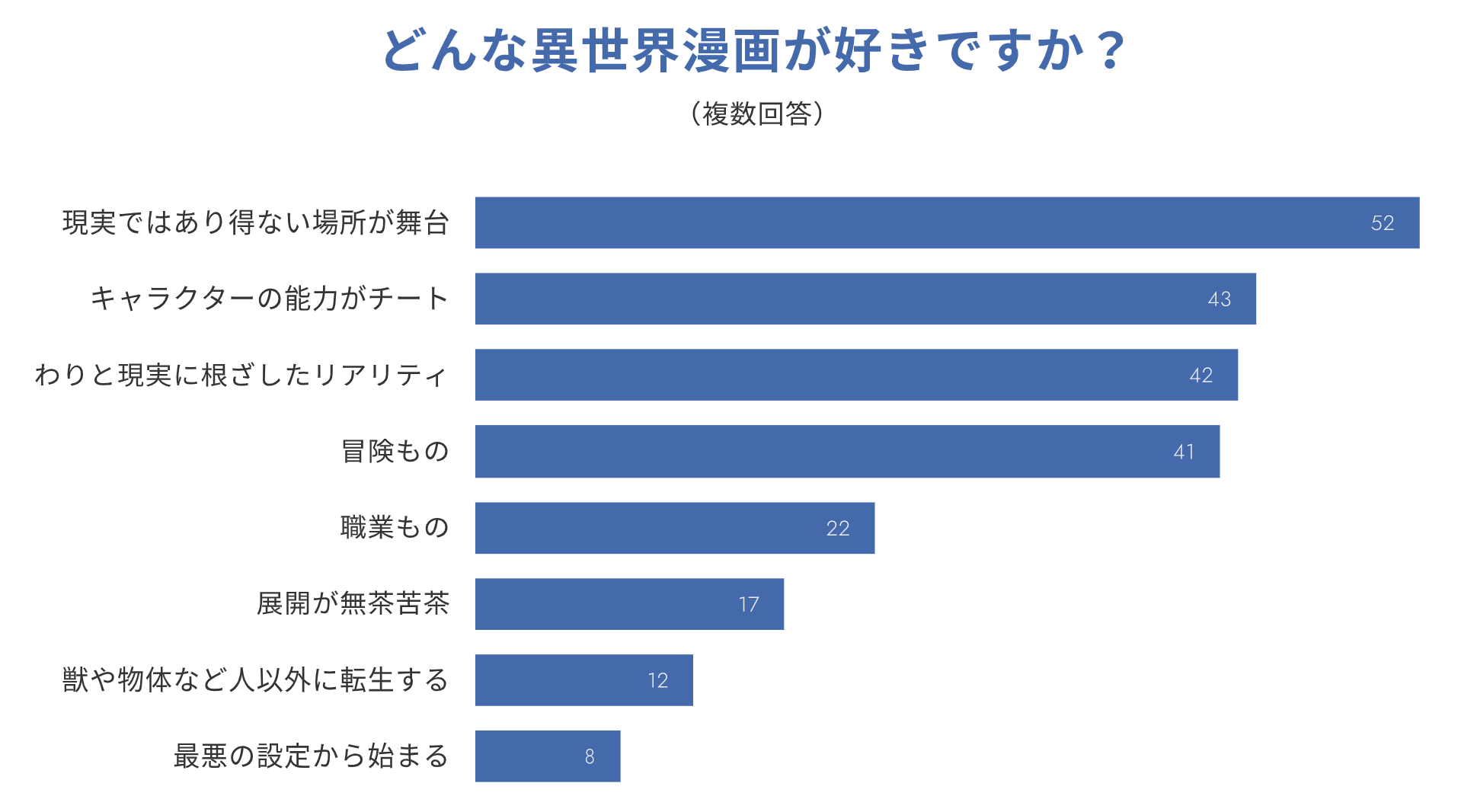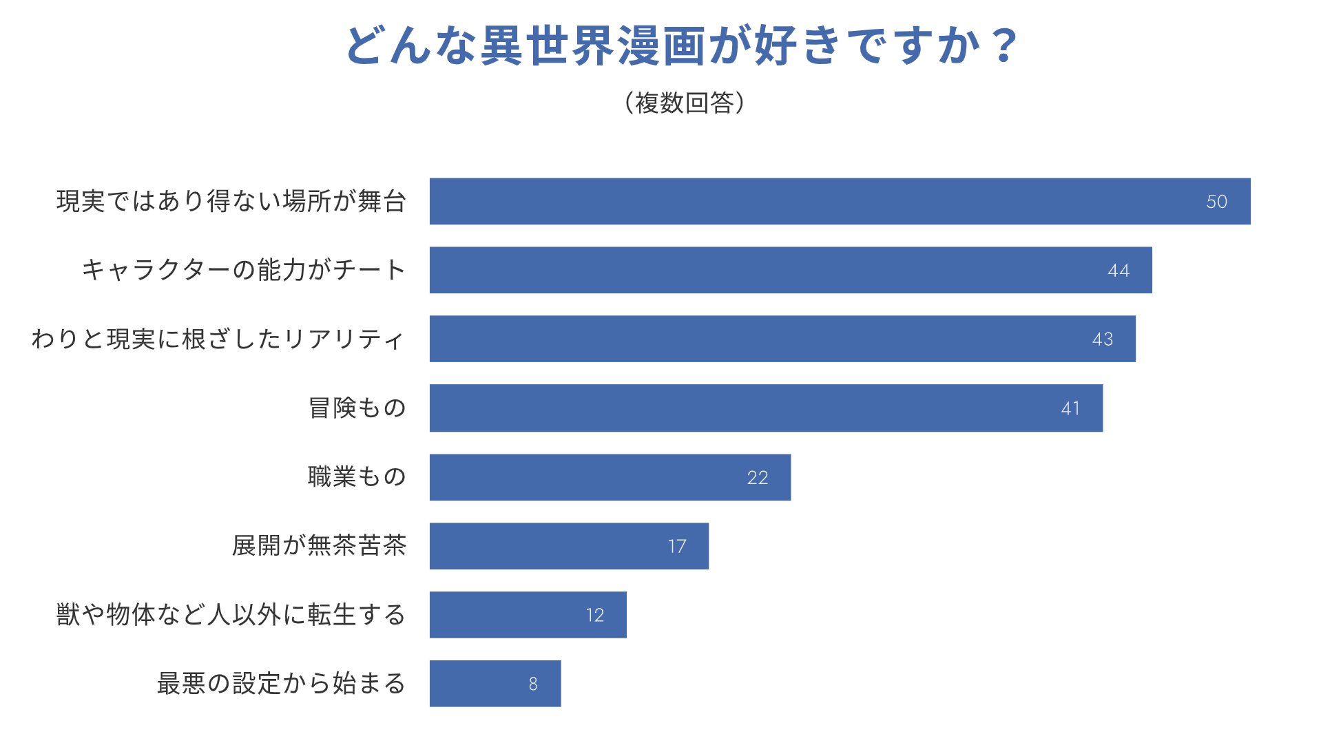 異世界漫画にはさまざまな舞台設定・シチュエーションがあるので、自分好みの設定から選ぶ人が多いことが分かりました。