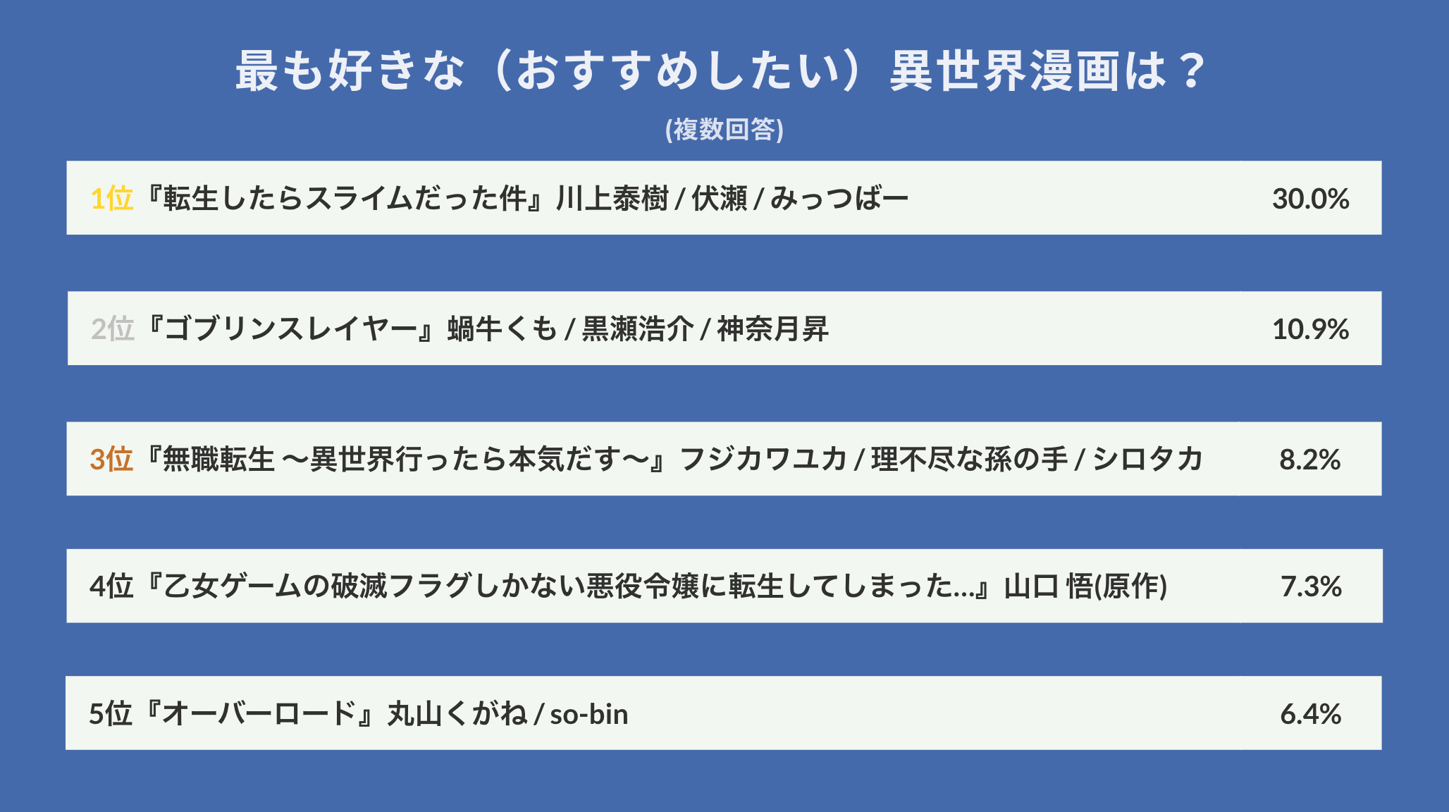 最も好きな(おすすめしたい)異世界漫画についても、1位に選ばれたのは『転生したらスライムだった件』(30.0%)でした。