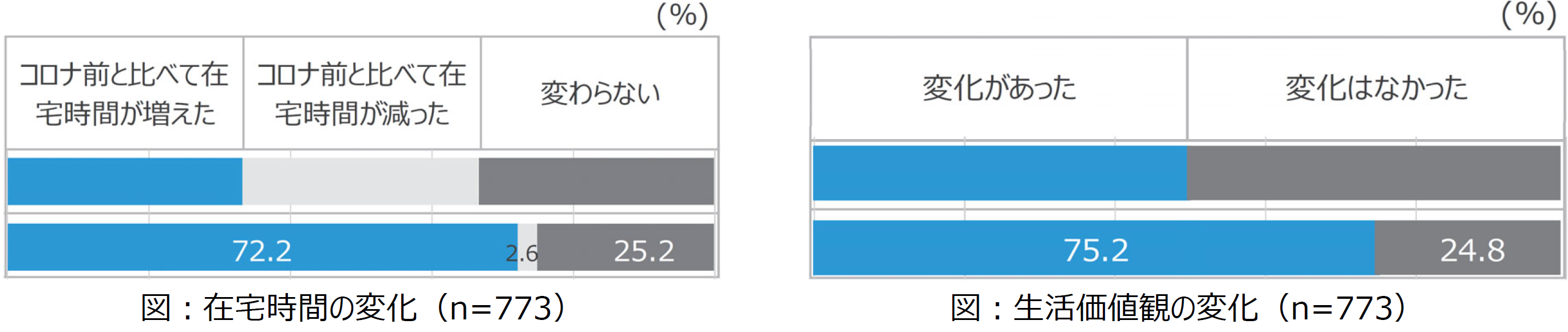 - 72%の方が「在宅時間が増えた」と回答、「生活の価値観に変化があった」と回答した割合は75%