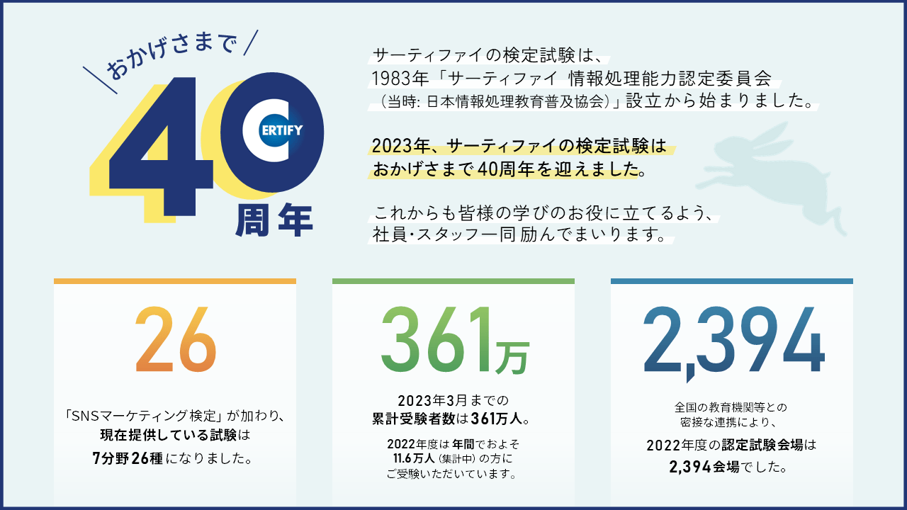 サーティファイは、1983年に前身となる「日本情報処理教育普及協会」を設立し、情報処理技術者能力認定試験の提供を開始しました。サーティファイの検定試験は、2023年で40周年を迎えます。