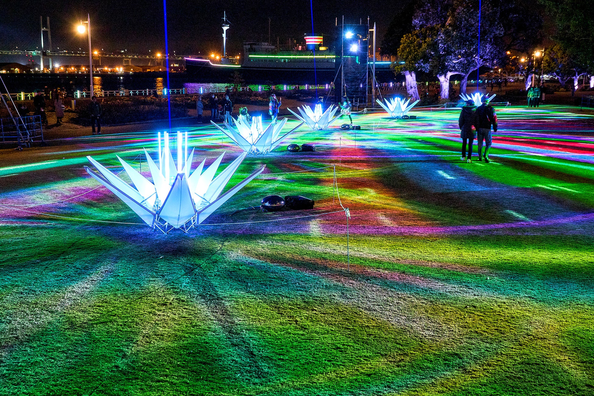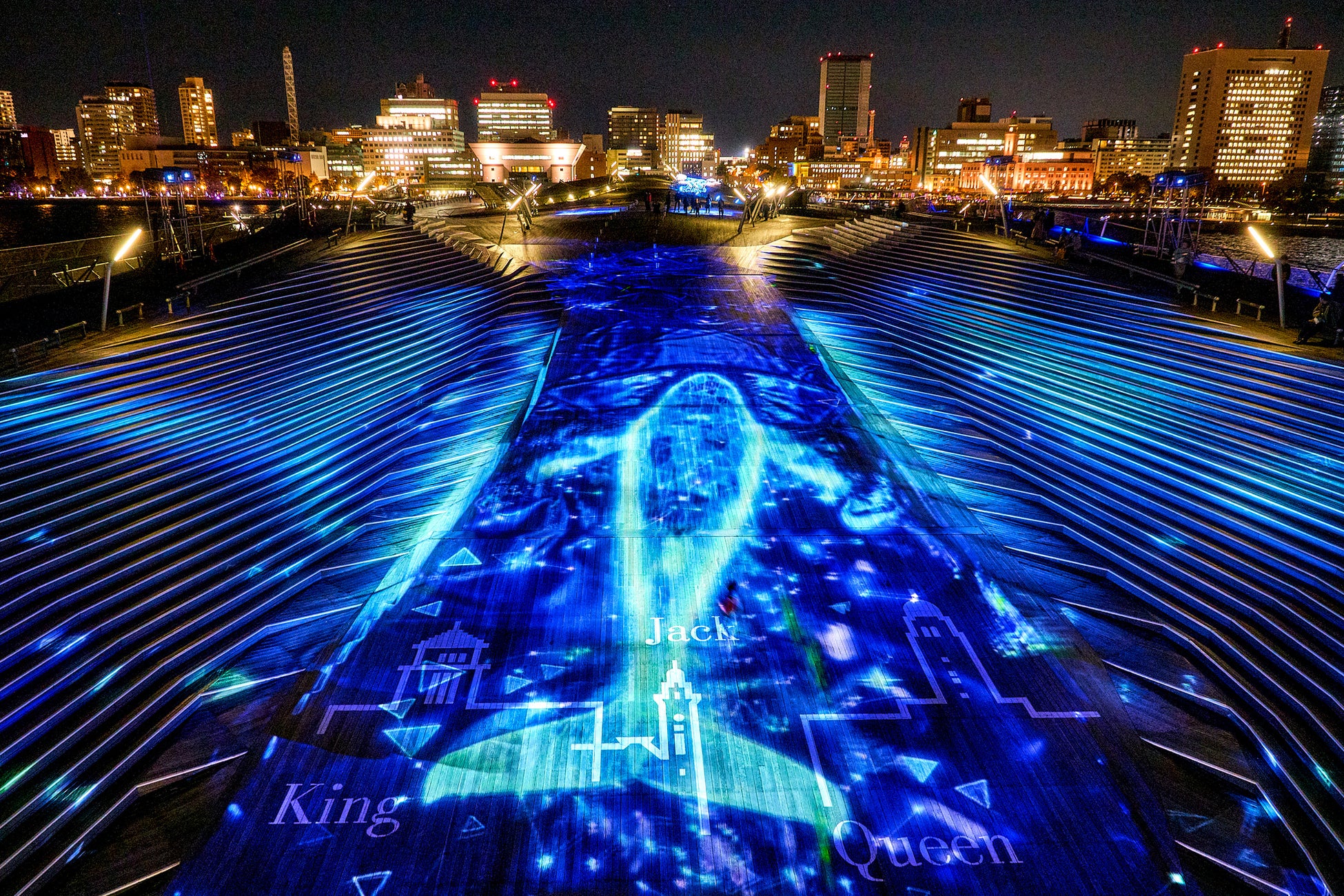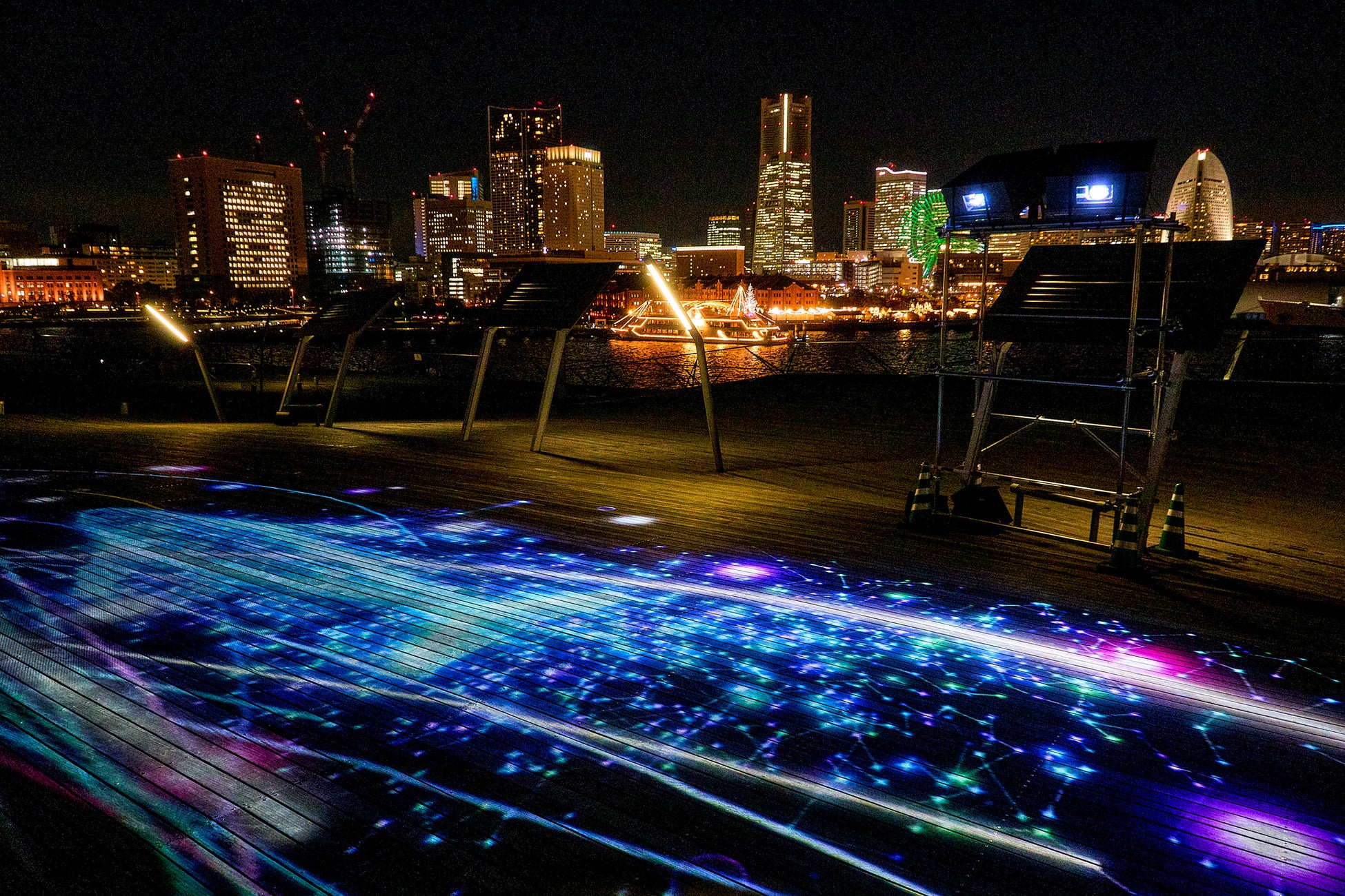 また今年の大さん橋会場は、国内最大級の参加型屋外プロジェクションマッピングを中心に、演出エリアを拡大します。さらに、山下公園会場では、花をモチーフにした光のオブジェを中心に、全長