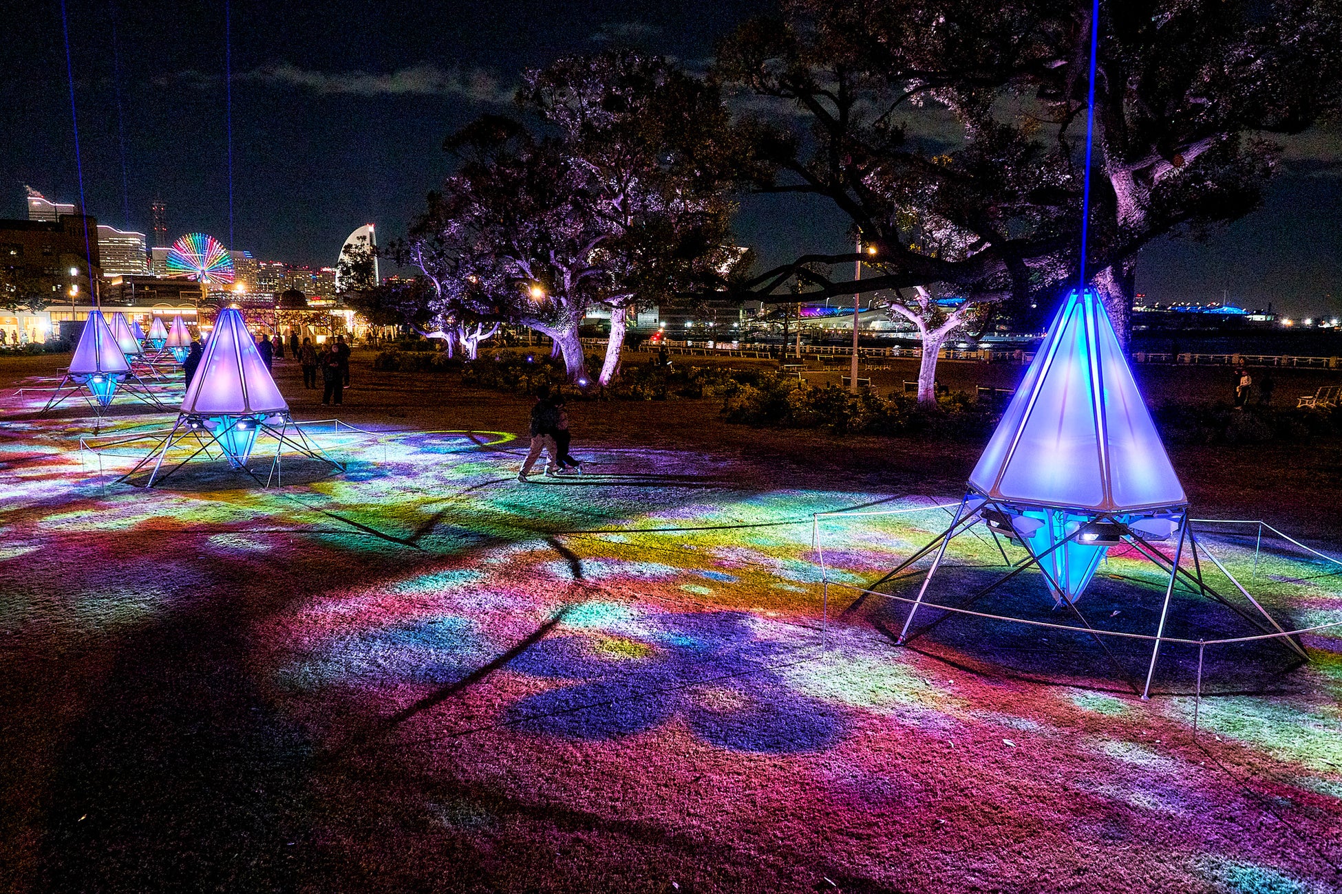 23台の光輝くオブジェは光に包まれた庭園を創りだします。芝生の上に映し出される光のデジタルアートは、人の動作に反応し、変化します。まさに光と戯れるような、特別な体験ができます。また、中心に鎮座する“スターフラワー”は、「ハイライト・オブ・ヨコハマ」の演出時間にあわせ、花が開きます。さらに、光るくじらが大さん橋からお散歩に来ることも!