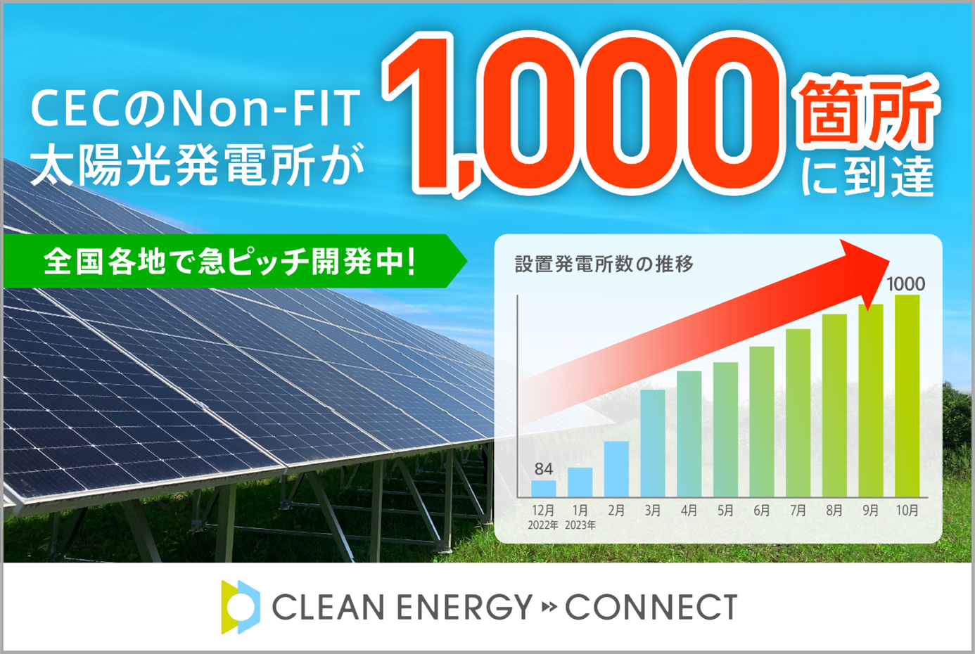 脱炭素経営企業、RE100参加企業等のお客様に対してNon-FIT太陽光発電によるグリーン電力と環境価値をお届けする株式会社クリーンエナジーコネクト(代表取締役:内田鉄平、以下「クリーンエナジーコネクト」)は、発電を行っているNon-FIT太陽光発電所が、合計1,000箇所(10か月で約920箇所を新たに開発)になりましたのでお知らせします。