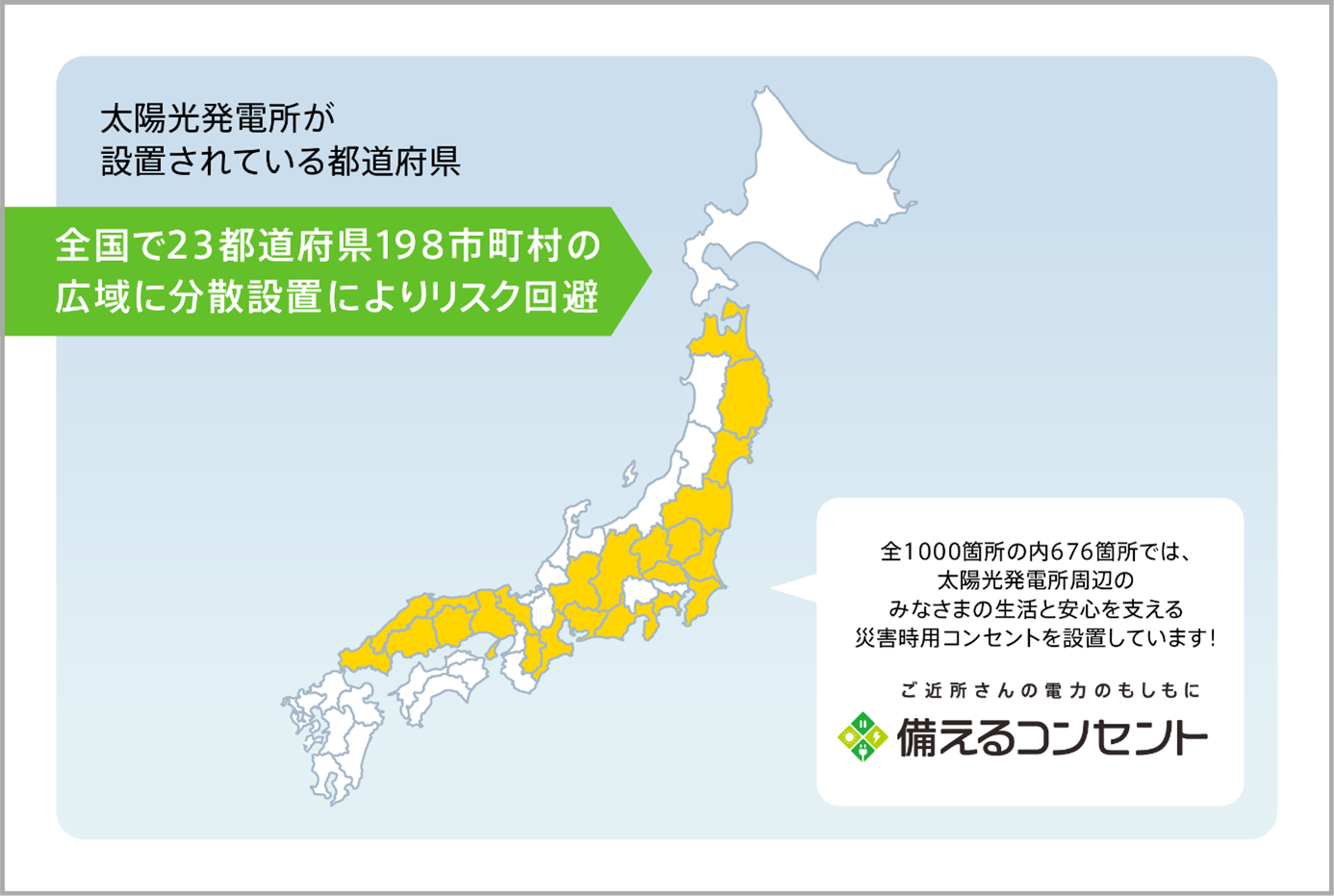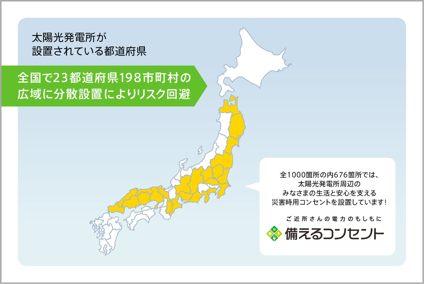 合計1,000箇所のNon-FIT太陽光発電所は、全国で23都道府県198市町村の広域に分散設置しており、発電所ポートフォリオとして天候による発電量の変動の抑制、災害等のリスク分散を図っています。