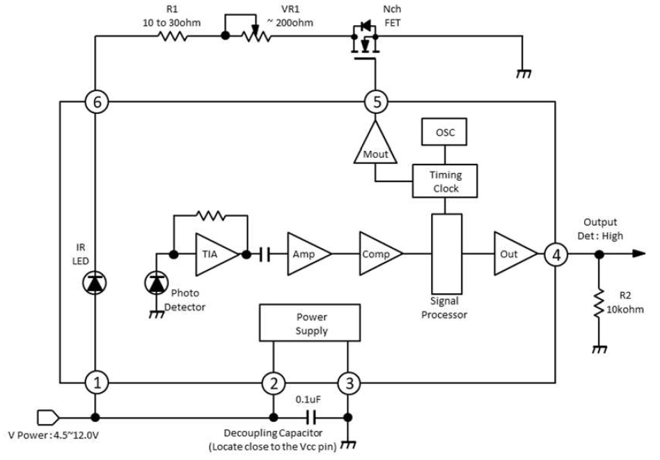 NJL5830Rは、高出力の赤外LEDと受光ICを独自のパッケージに組み込んだ反射型センサです。
